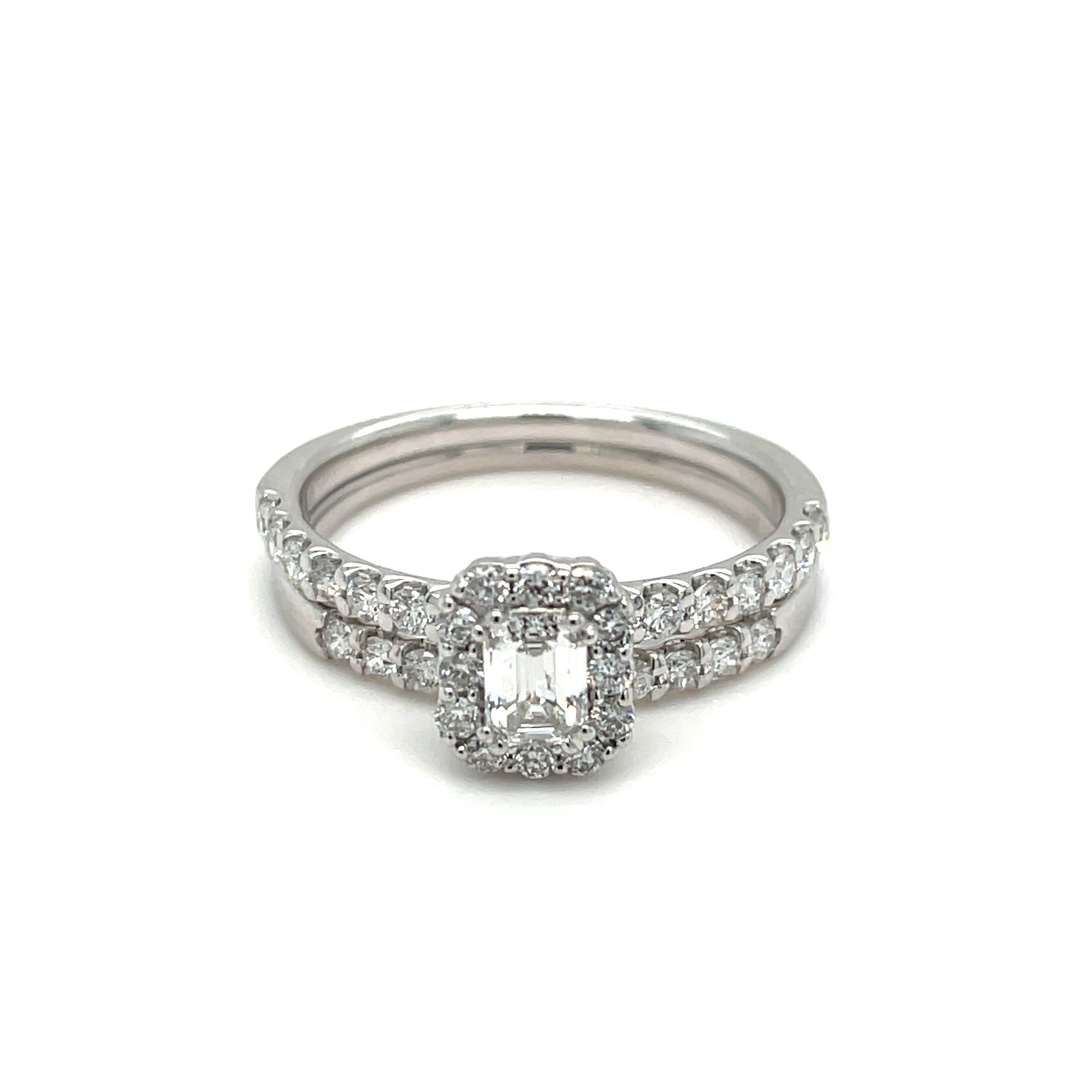 Lady's White 14 Karat Halo Bridal Set Engagement Ring Size 7 Melee Carat Weight: 0.75 Melee Quality: HSI Shape: Emerald Center Carat Weight: 0.33 Color: G Clarity: VS2