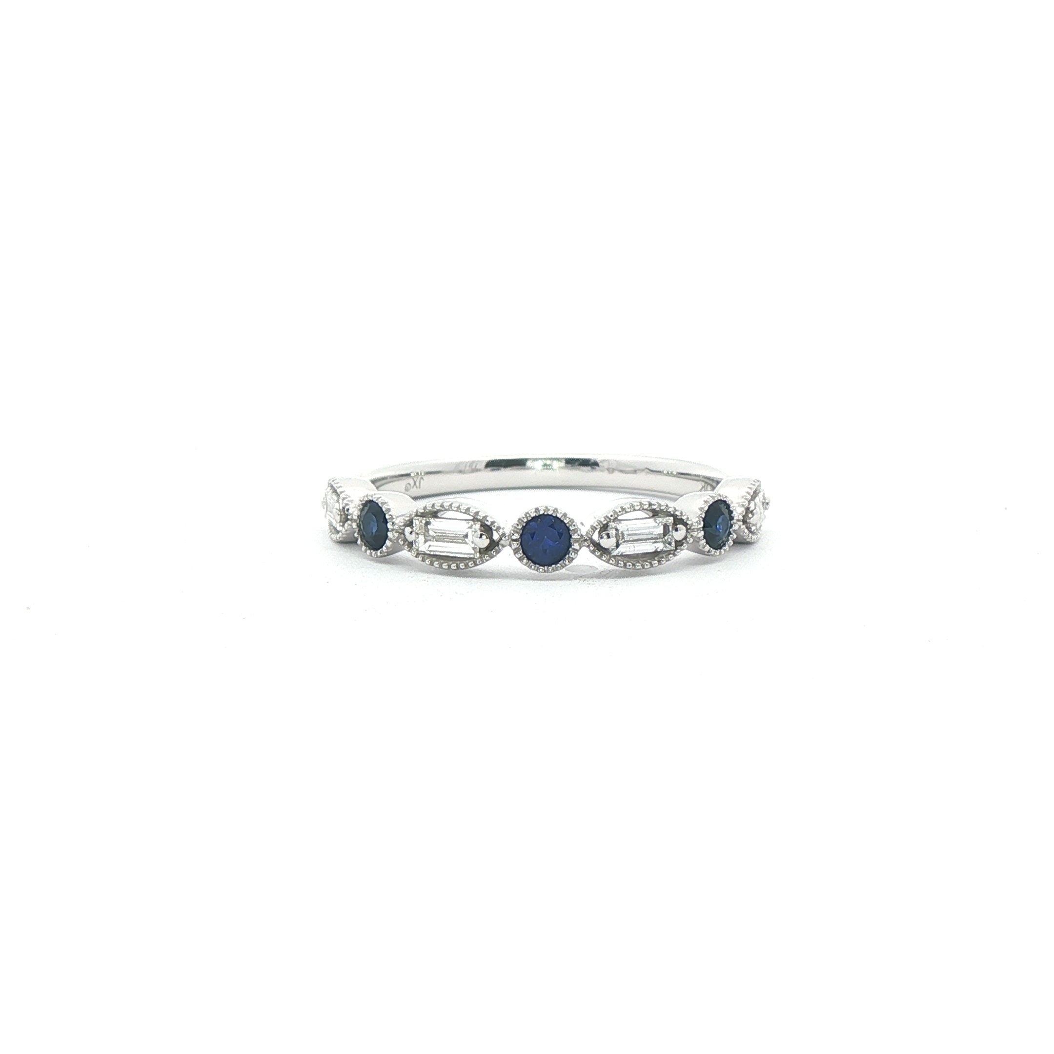 Lady's White 10 Karat Diamond And Sapphire Band Colored Ring Size 0.2 Melee Quality: HSI Major Stone Carat Weight: 0.12 Major Stone Color: Blue Major Stone Type: Sapphire