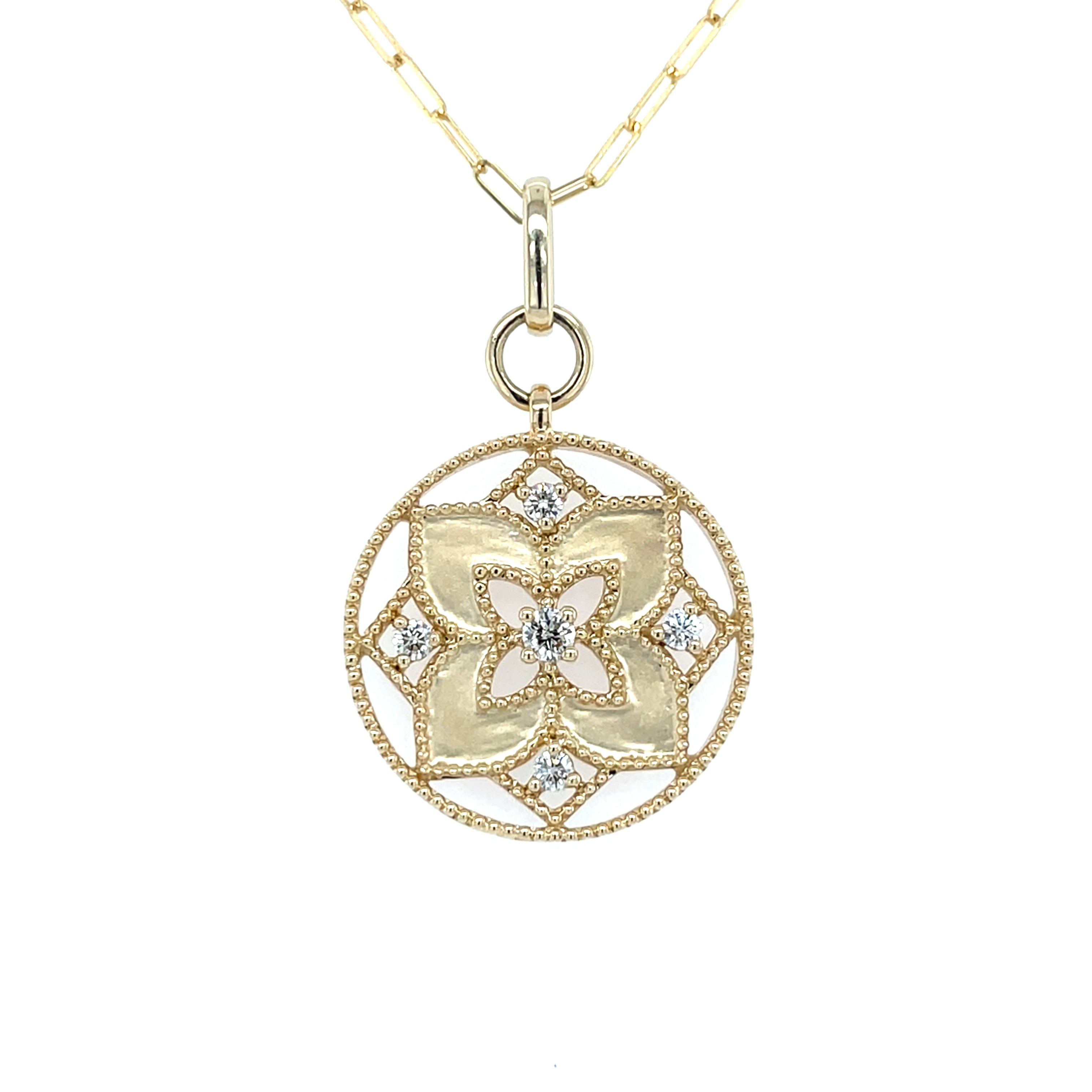 Elevate your style with this exquisite yellow gold pendant. It features a delicate, round brilliant cut diamond set within a floral-inspired design. This fine jewelry piece exudes elegance and sophistication, perfect for adding a touch of sparkle to any ensemble. Its timeless appeal makes it a treasured addition to any jewelry collection.