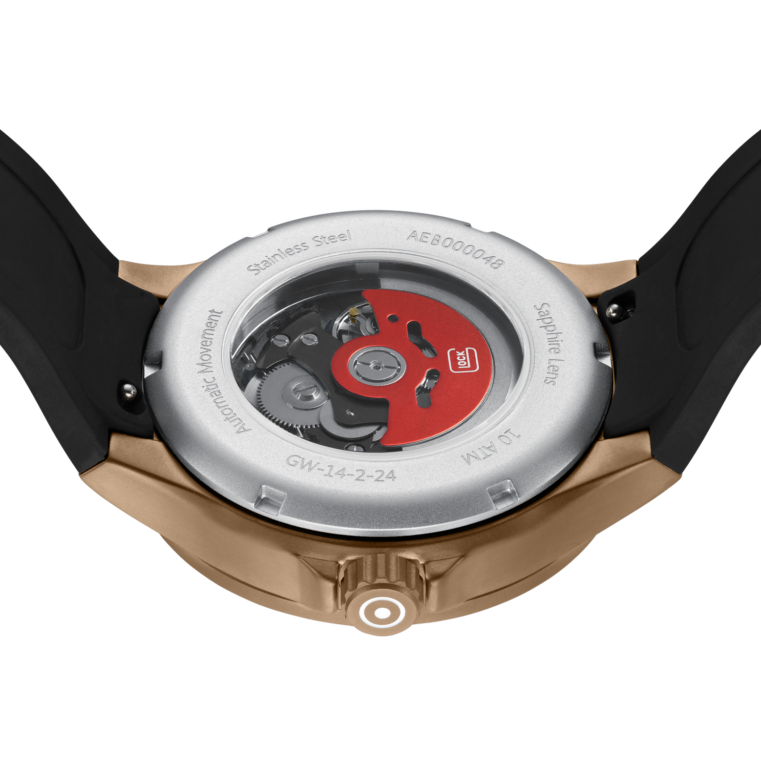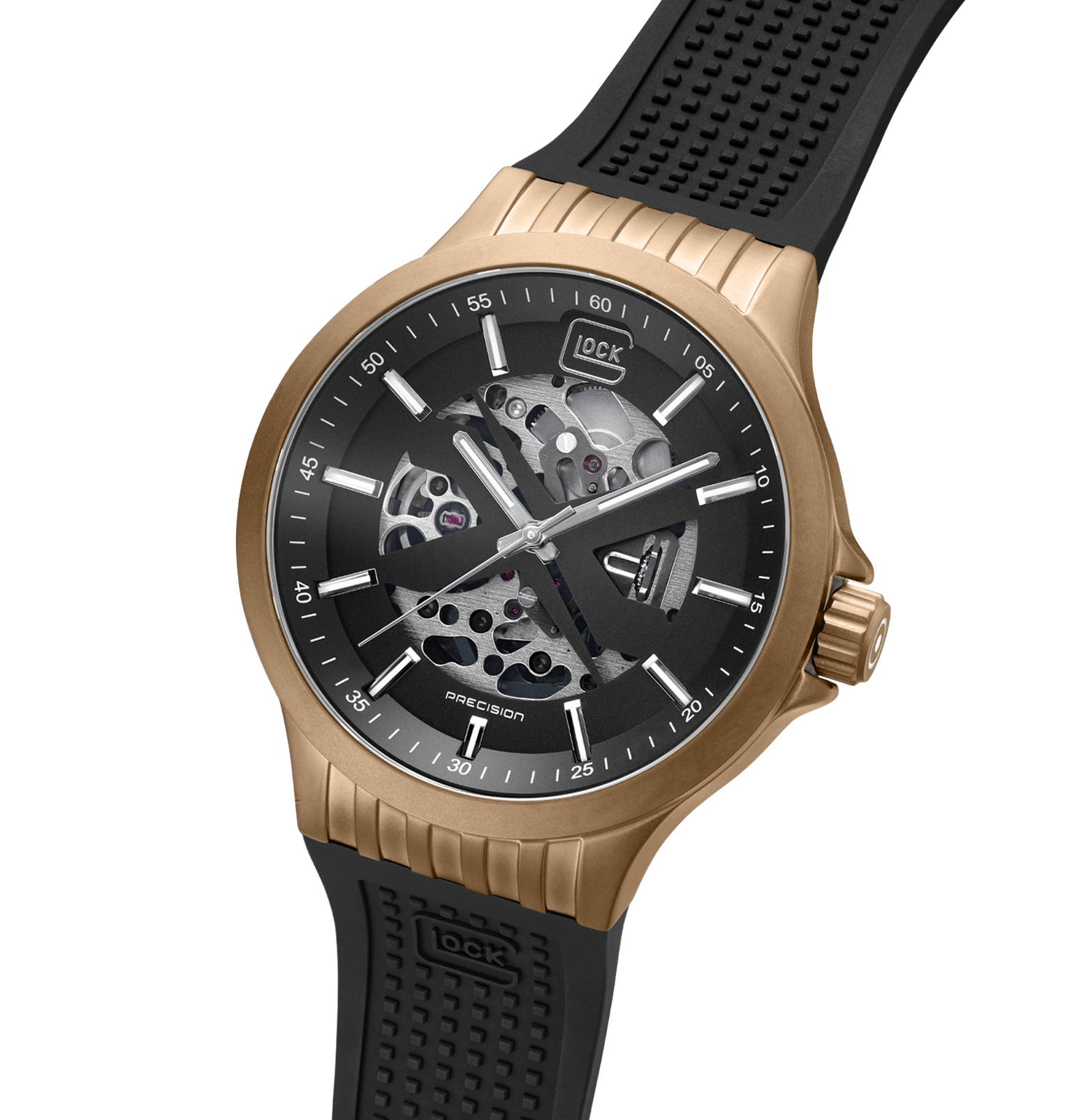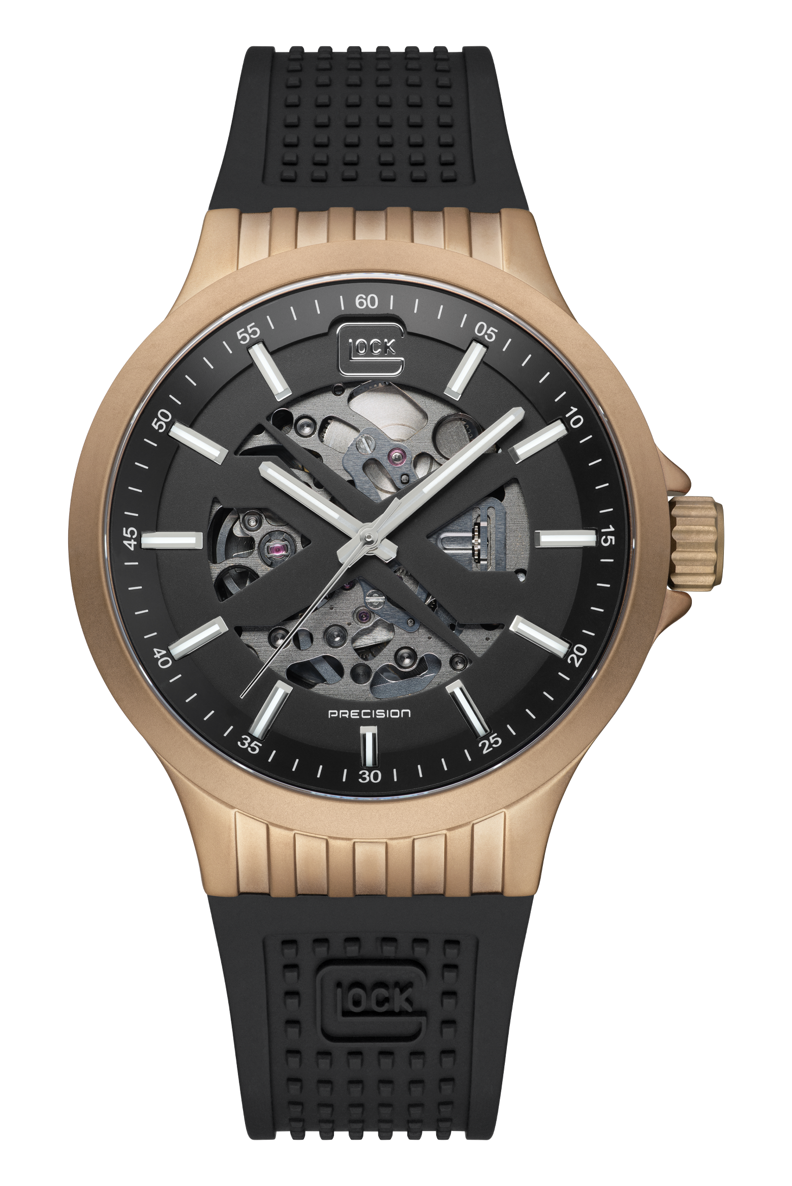 Glock Watches Gender: Men's Case Size (MM): 44 Strap: RTF Feature(s): Super-LumiNova hands and indices Movement: Automatic Case Color: Rose