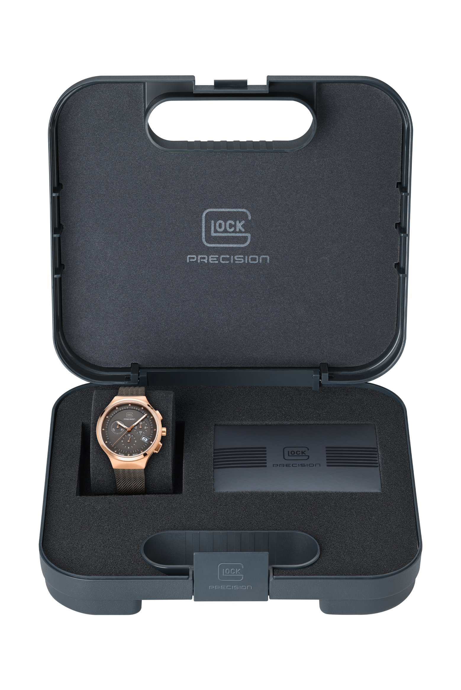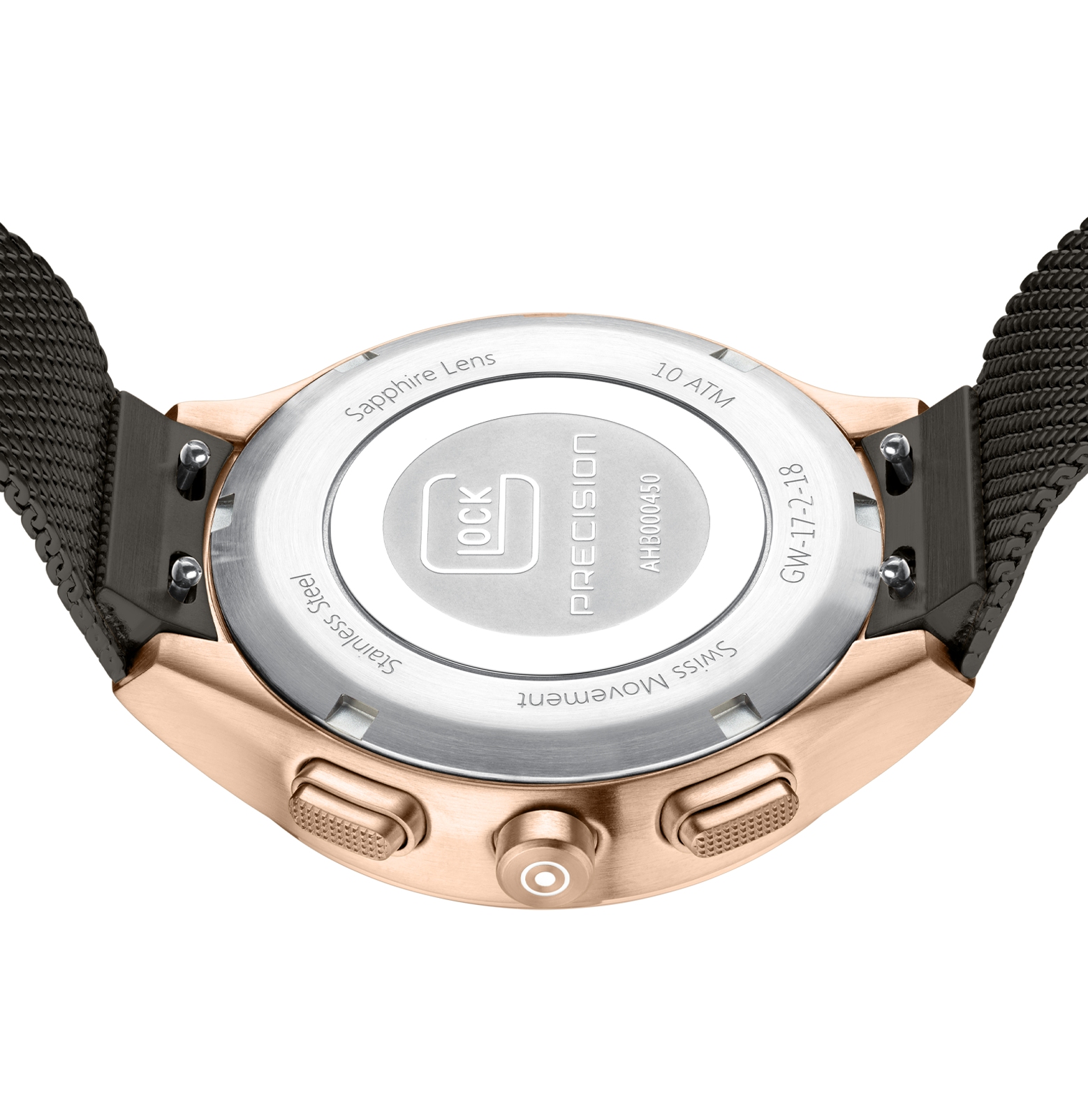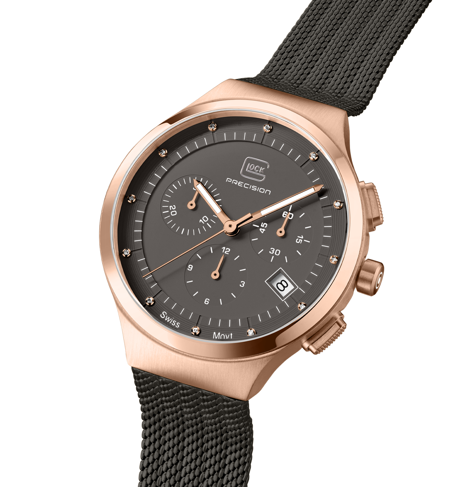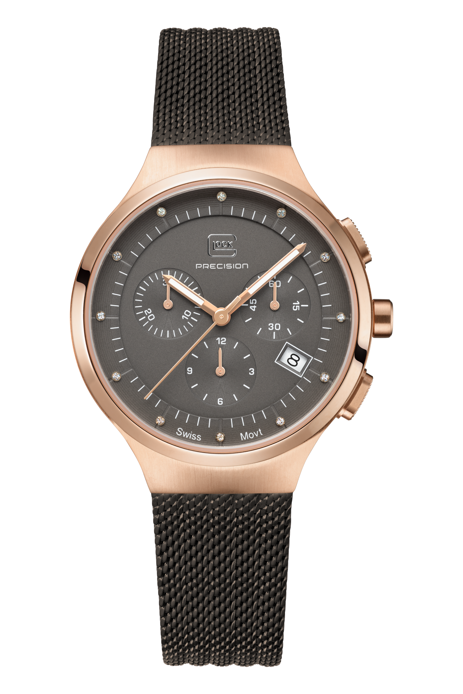 Glock Watches Gender: Ladies Case Size (MM): 38 Strap: Mesh Feature(s): Super-LumiNova hands and indices Movement: Quartz Case Color: Rose