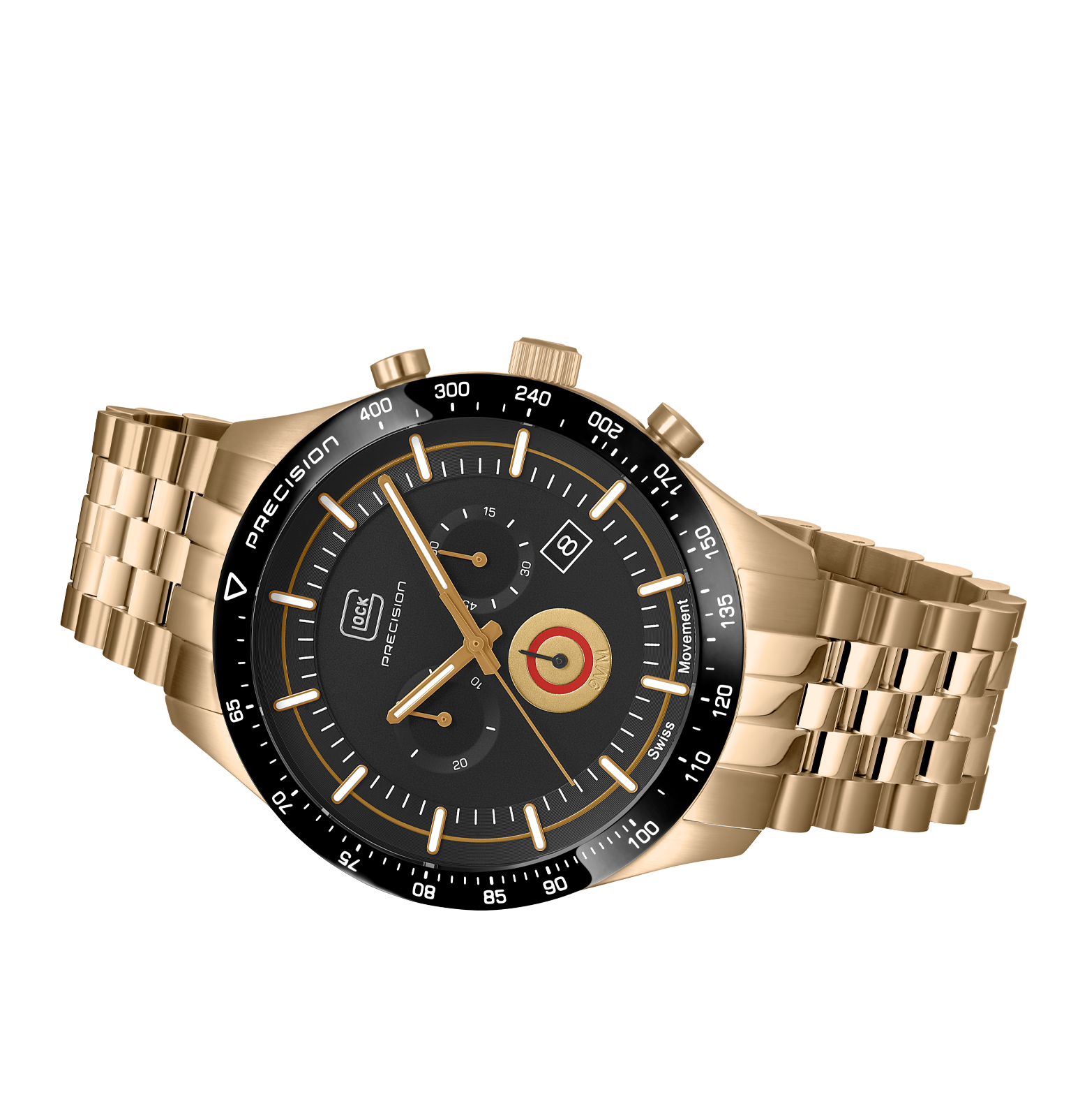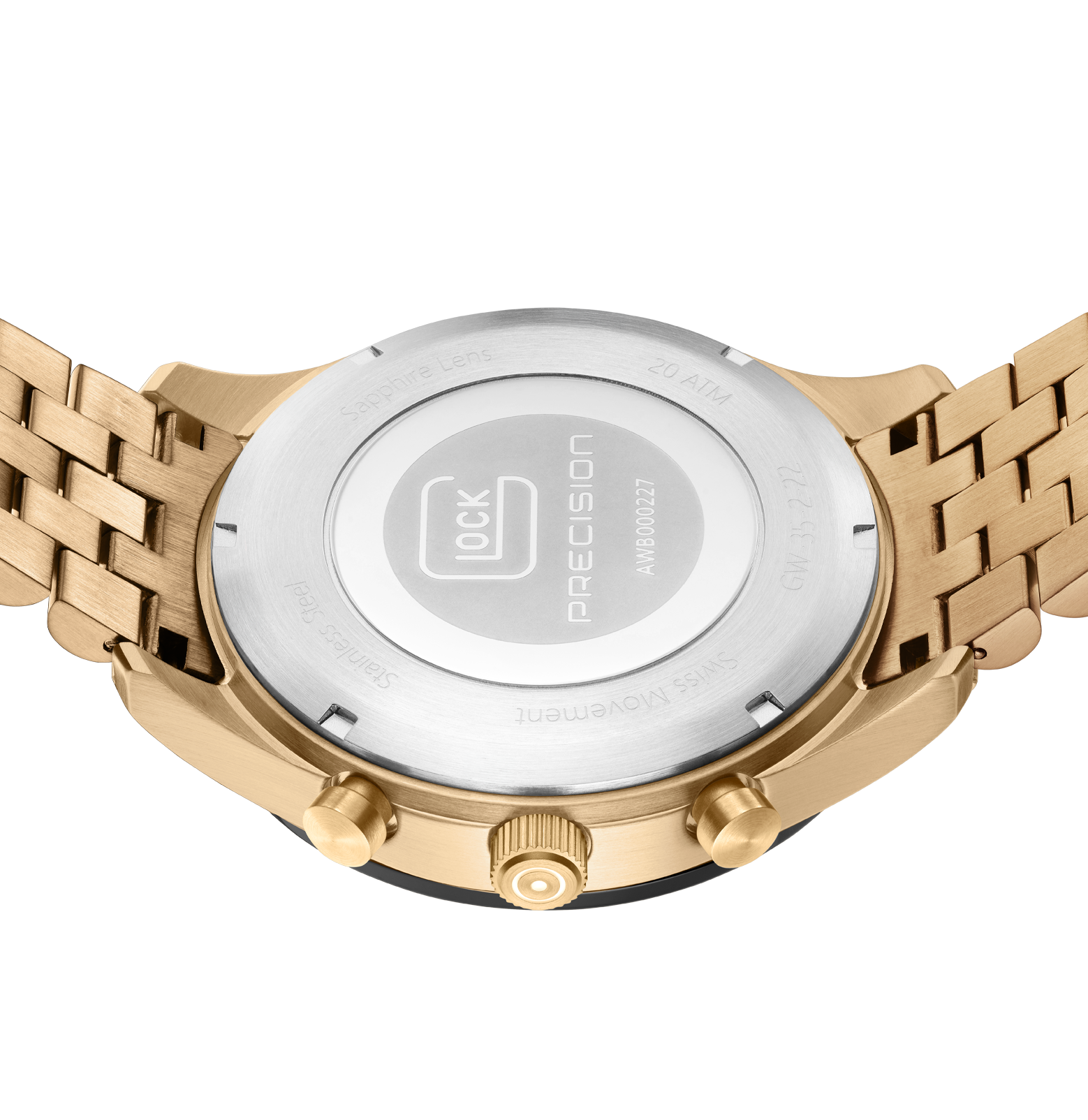 Glock Watches Gender: Men's Case Size (MM): 46 Strap: Link Feature(s): Super-LumiNova hands and indices Movement: Quartz Case Color: Stainless
