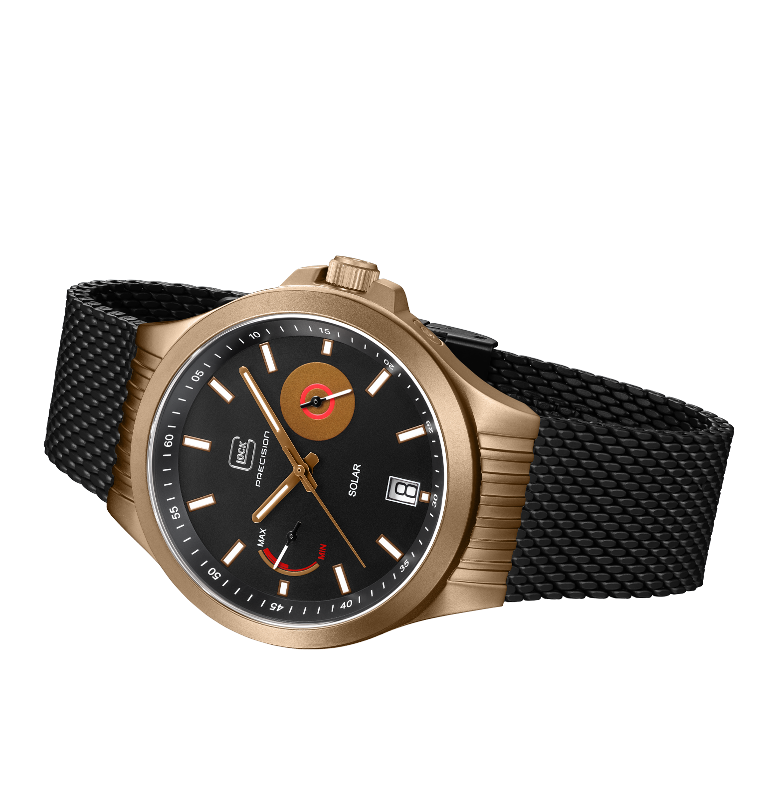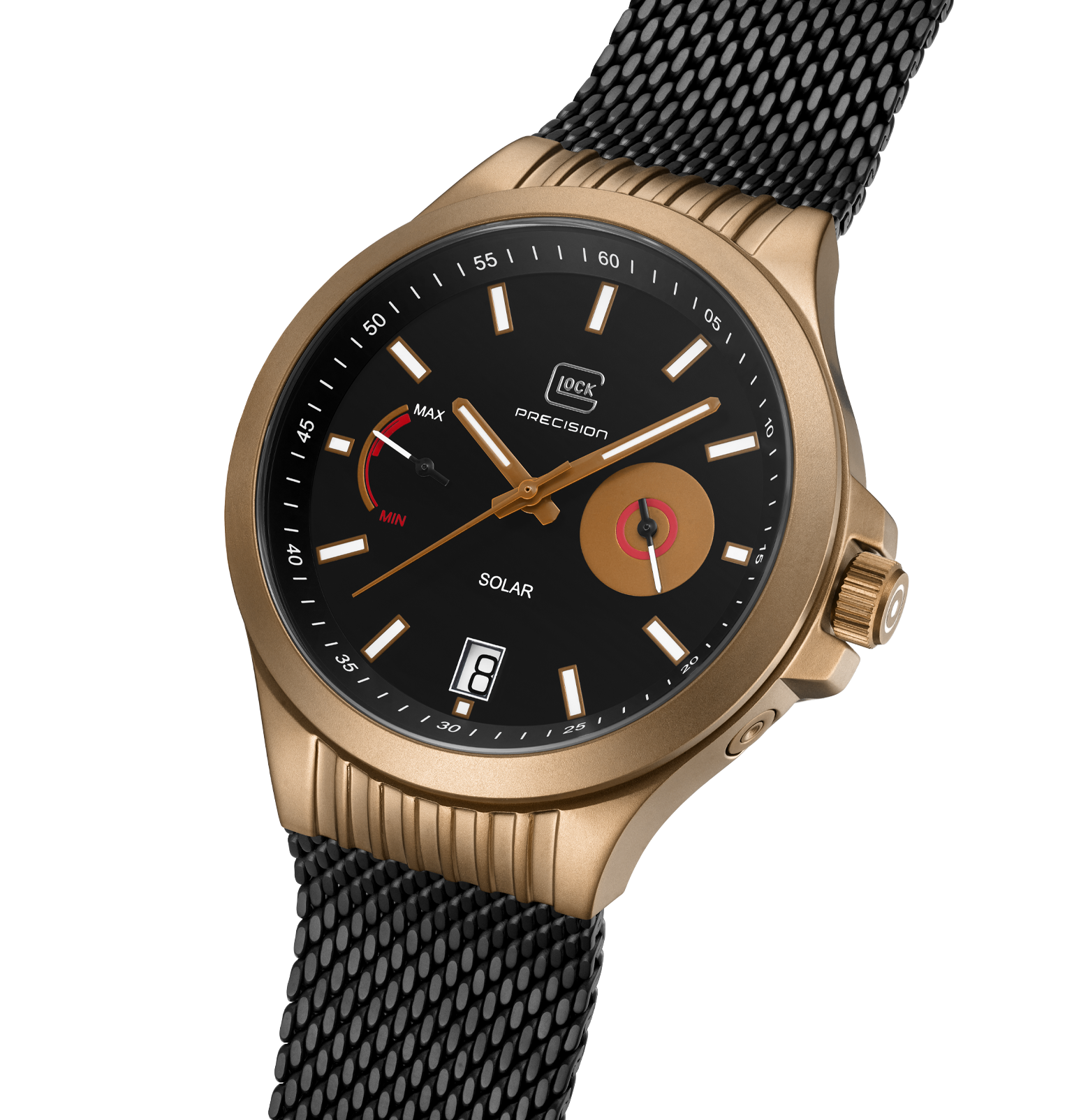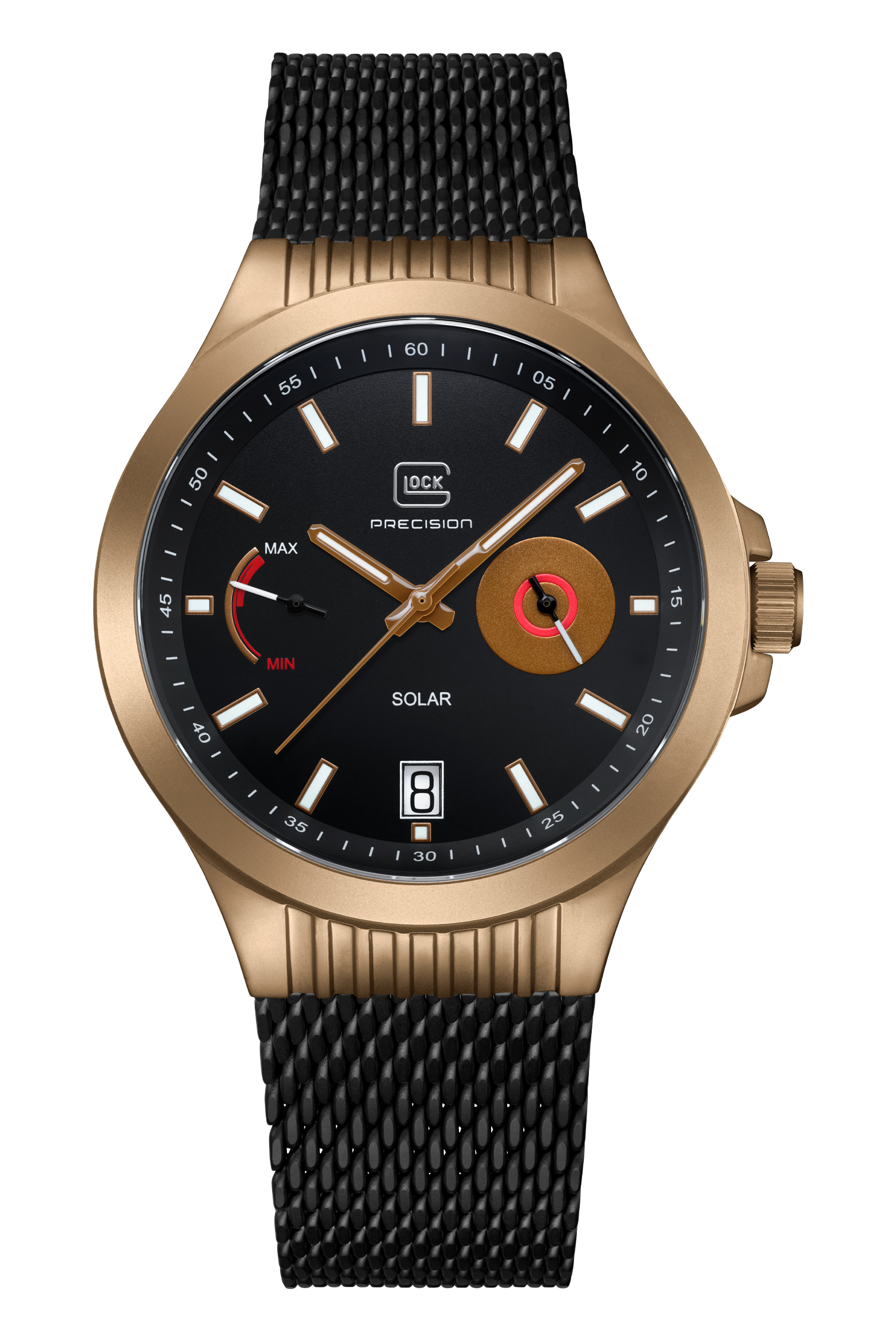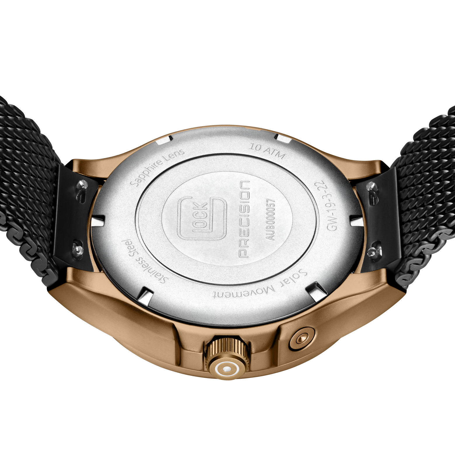 Glock Watches Gender: Gent's Case Size (MM): 42 Strap: Mesh Movement: Quartz Case Color: Brass