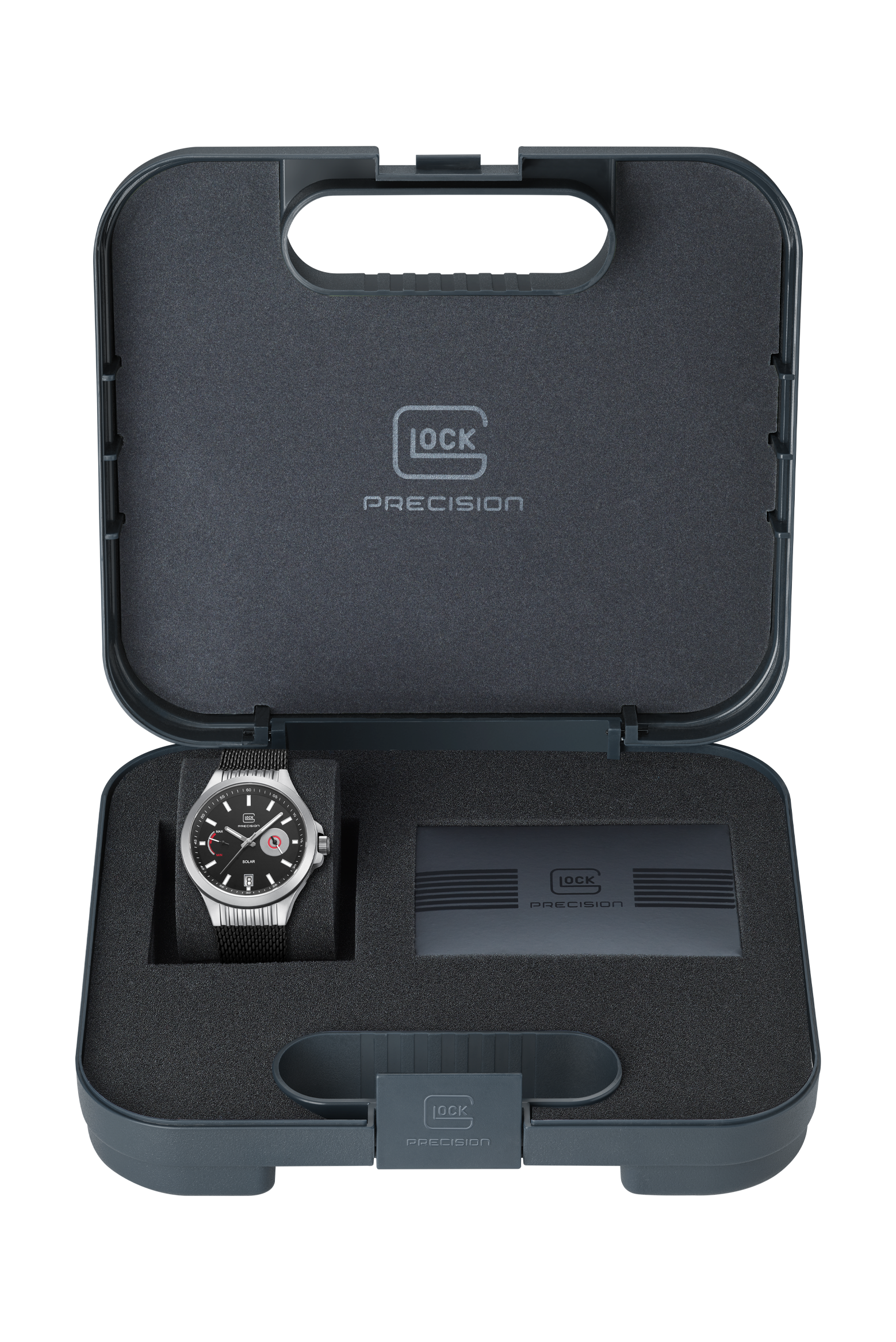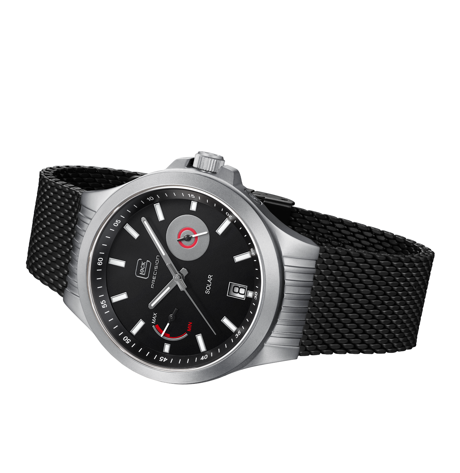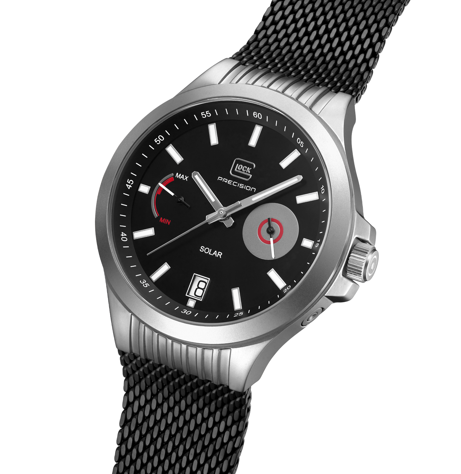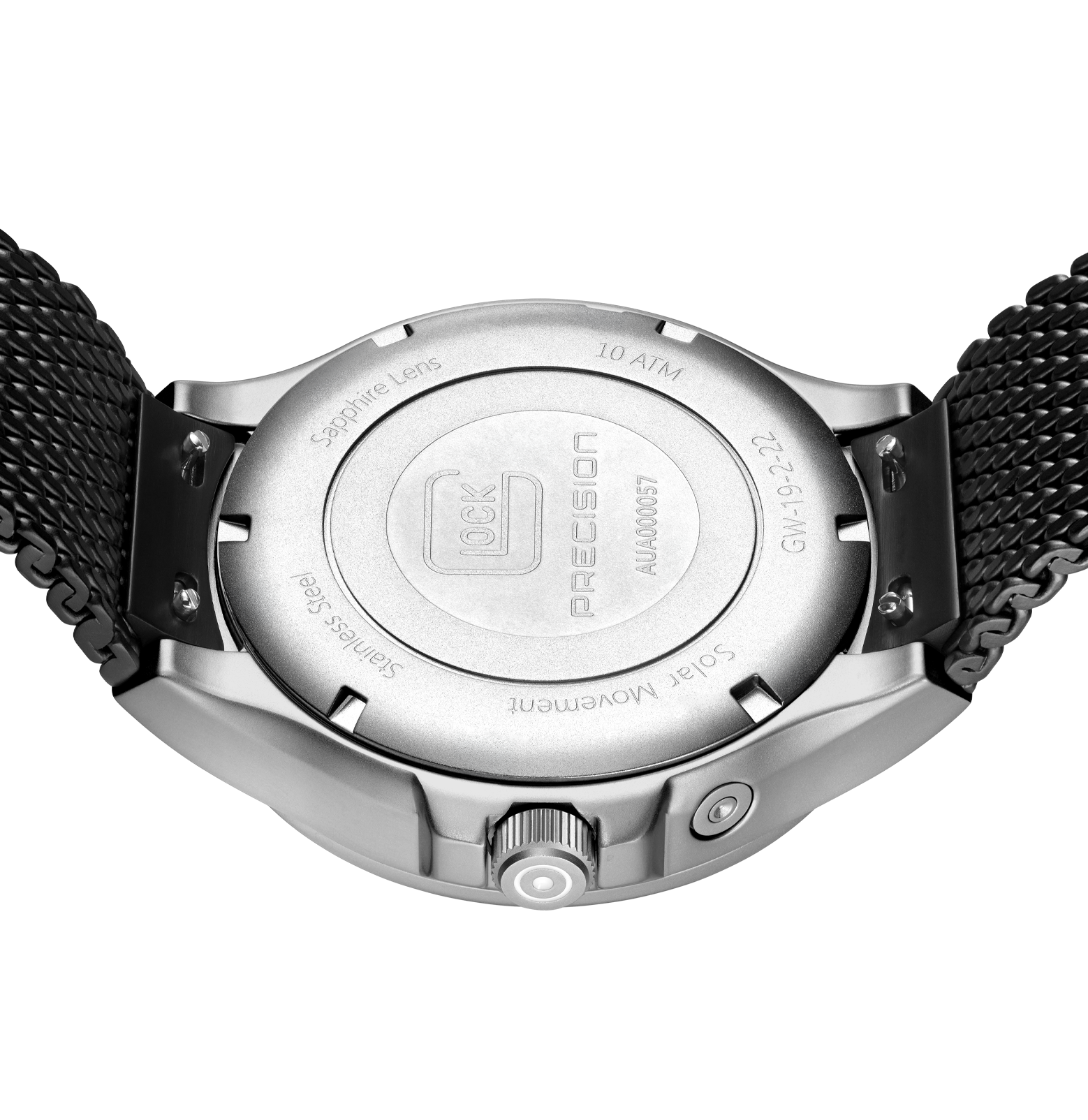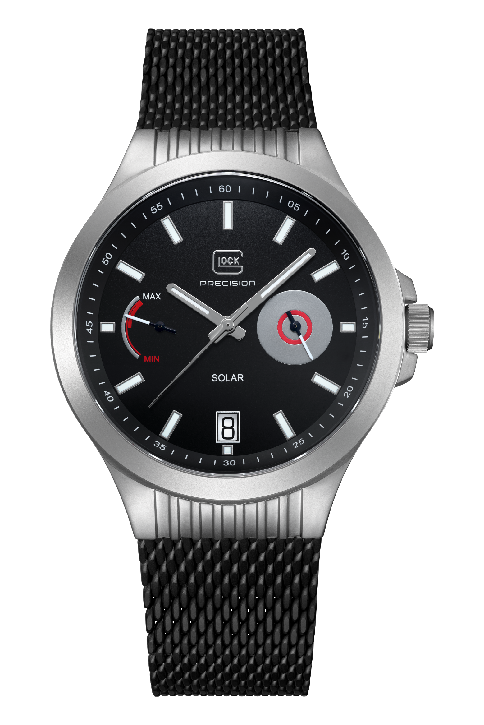 Glock Watches Gender: Men's Case Size (MM): 42 Strap: Mesh Feature(s): Swiss Super LumiNova Movement: Solar Case Color: Stainless