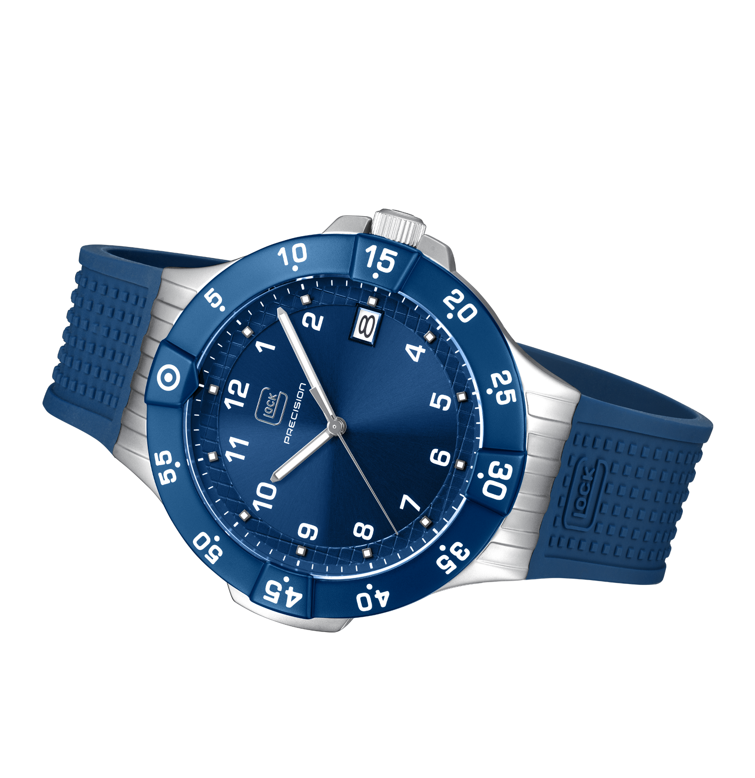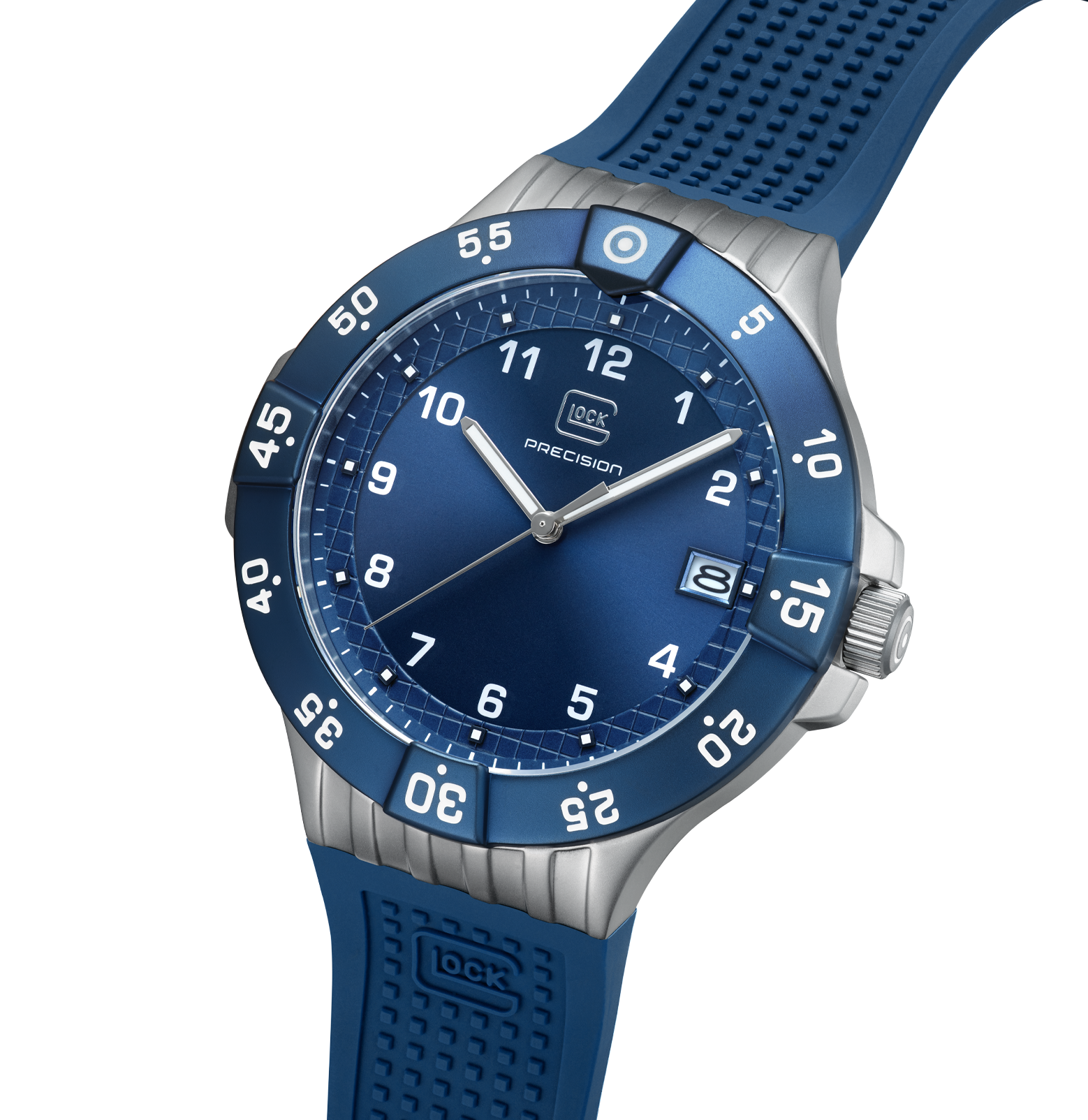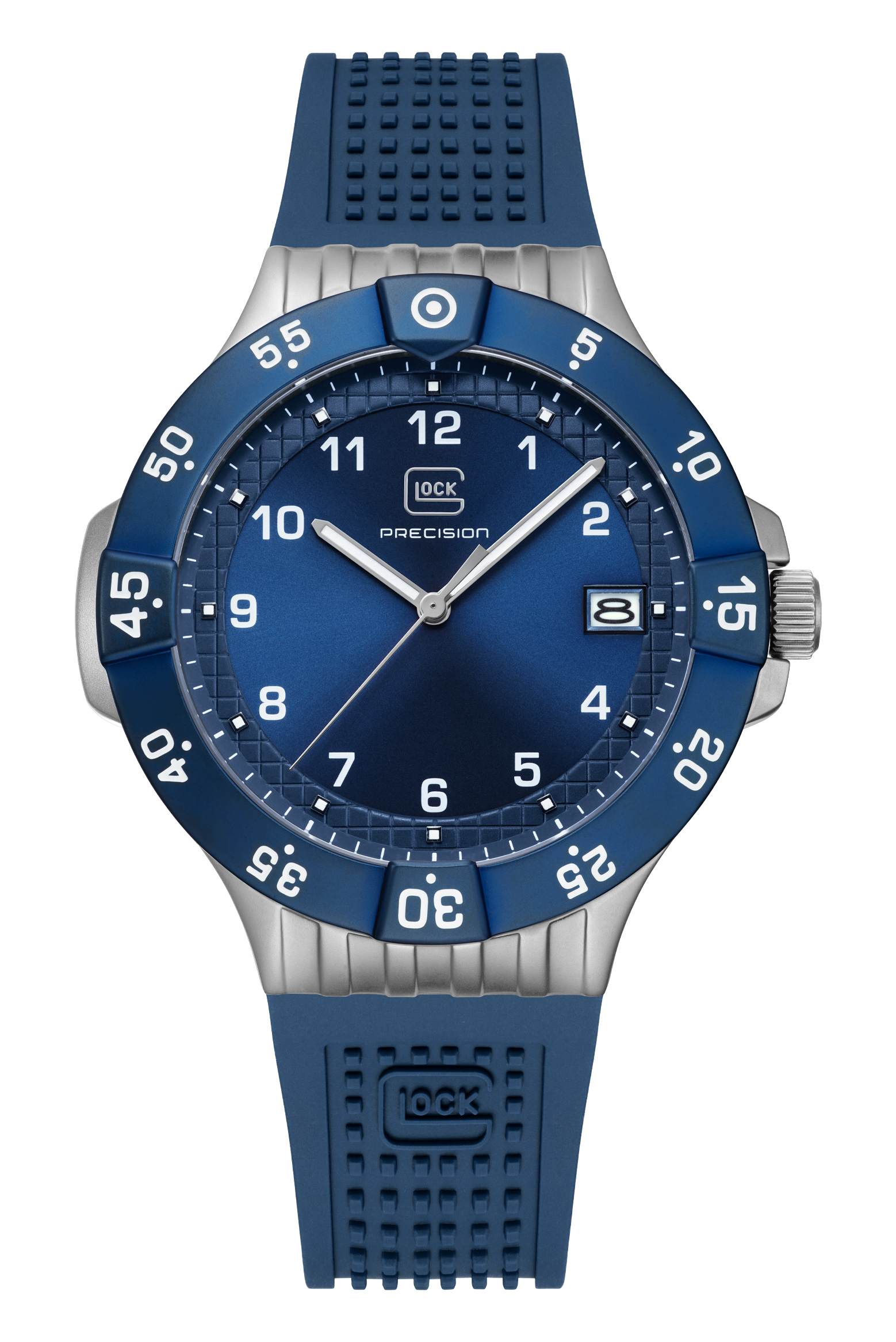 Glock Watches Gender: Men's Case Size (MM): 43 Strap: RTF Feature(s): Super-LumiNova hands and indices Movement: Quartz Case Color: Stainless