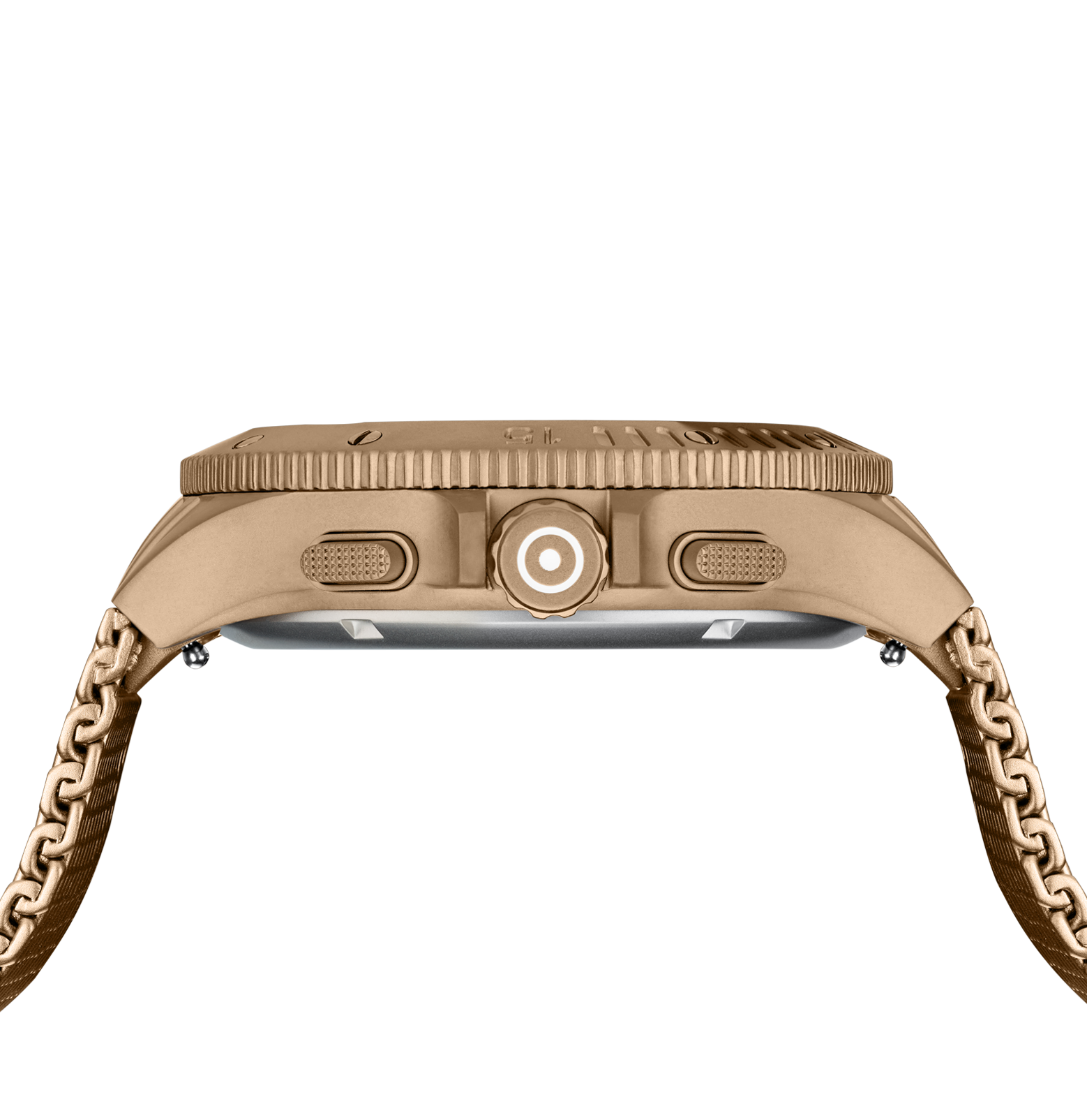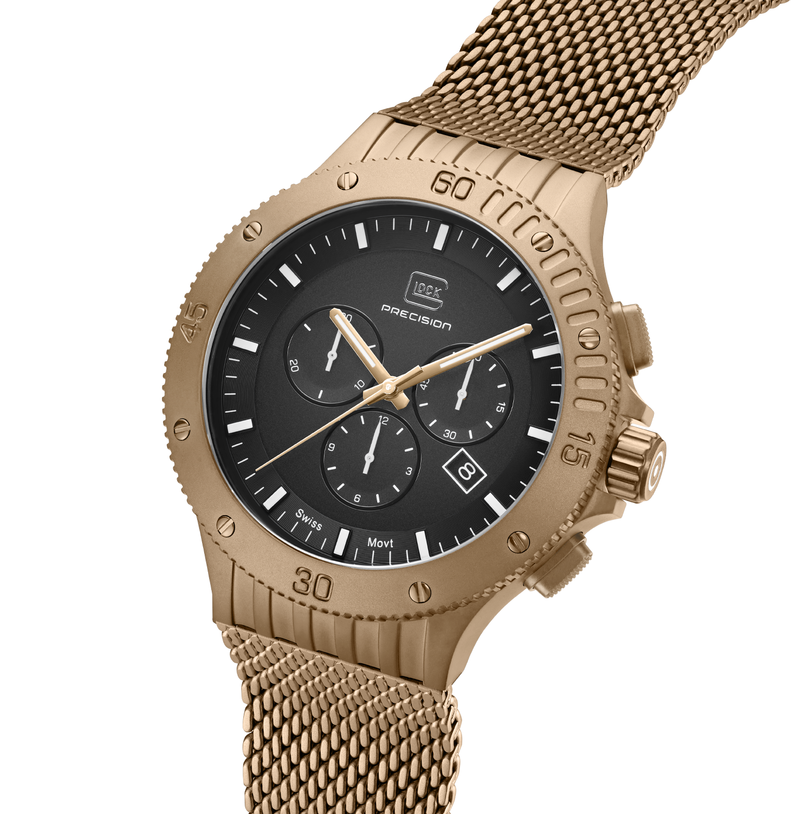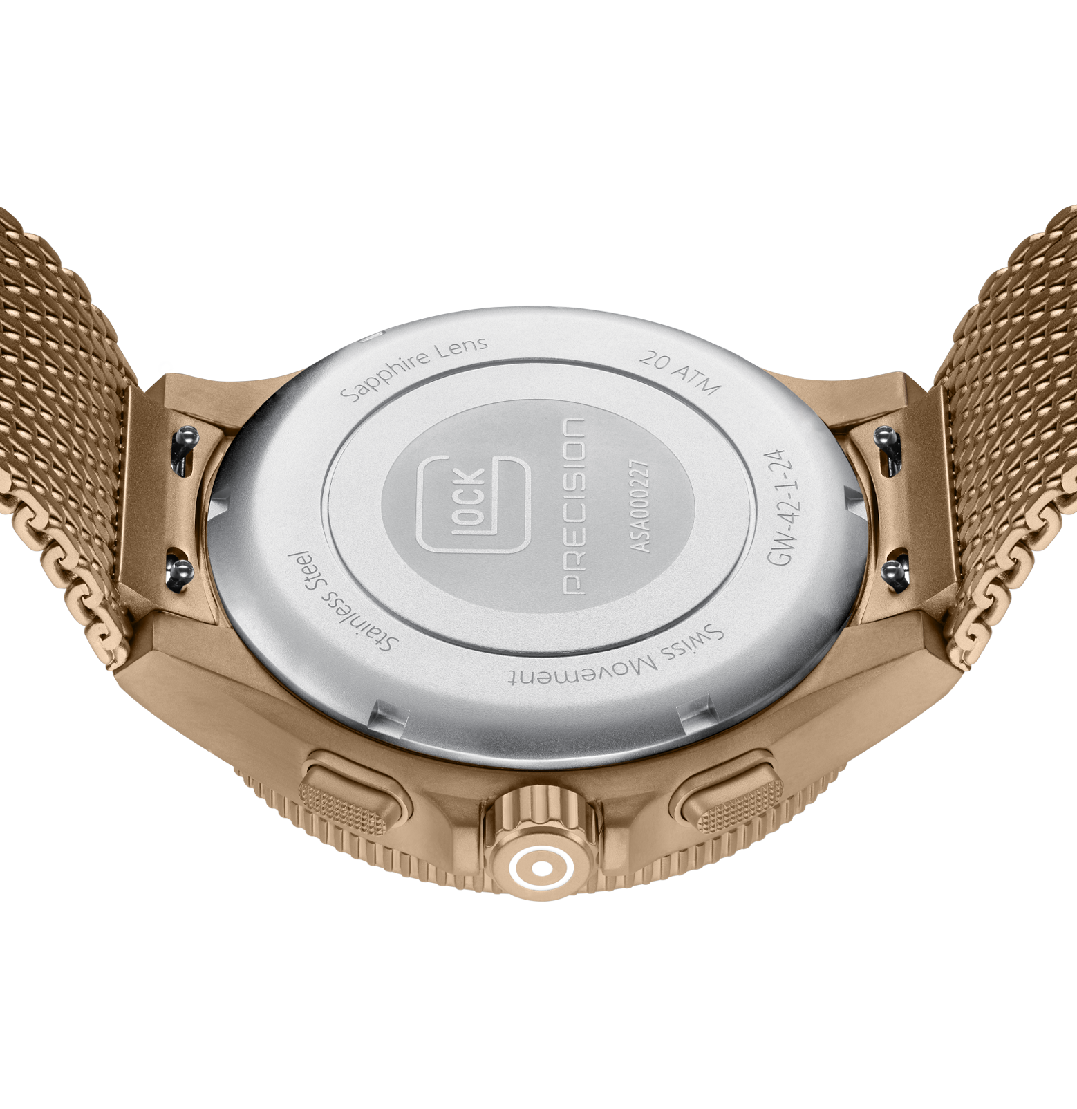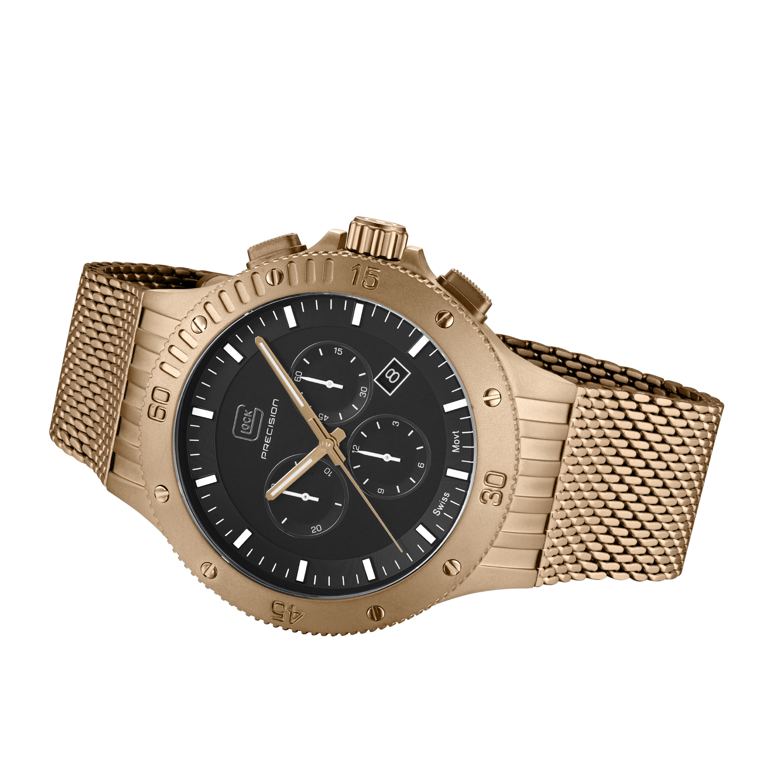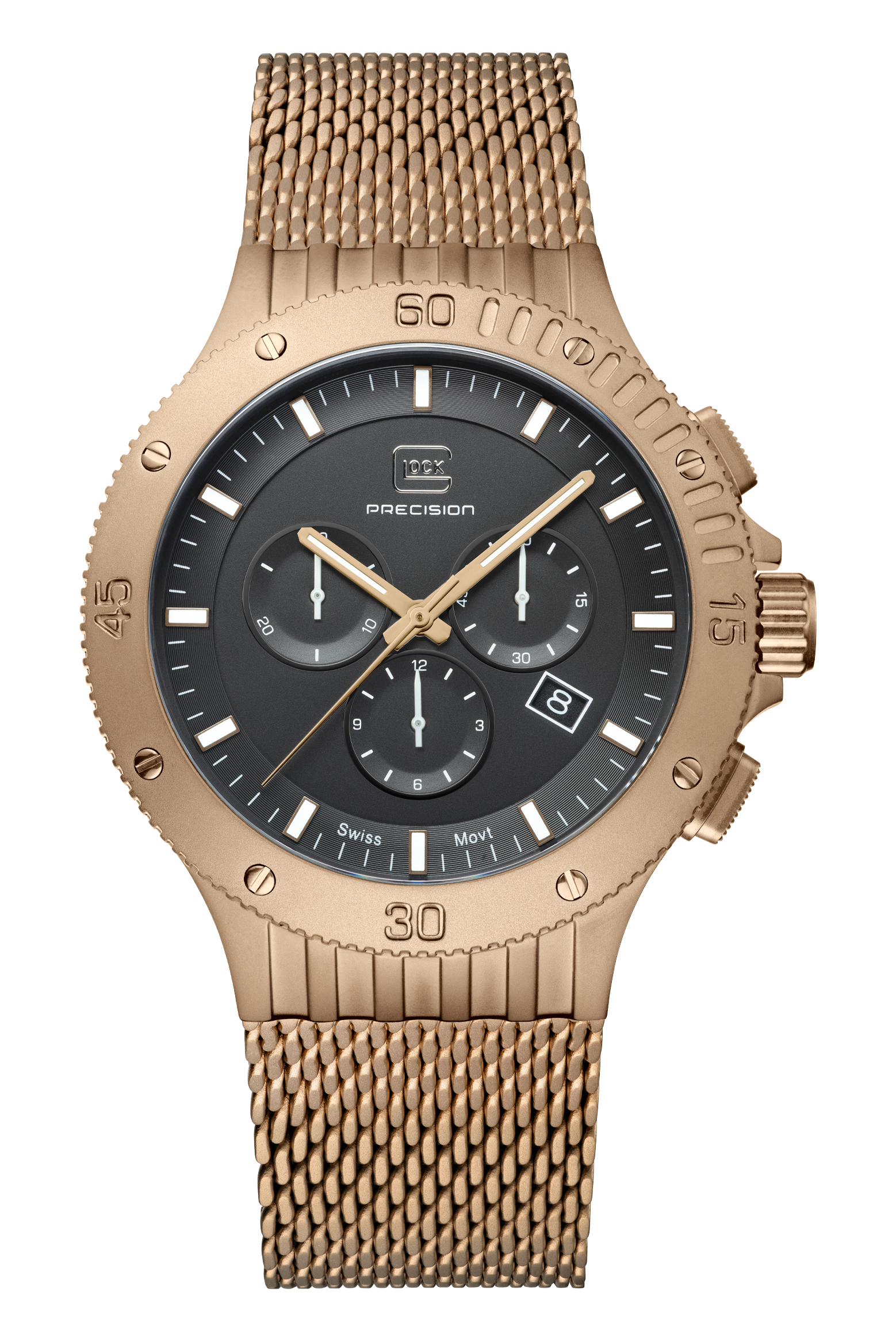 Glock Watches Gender: Men's Case Size (MM): 44 Strap: Mesh Feature(s): Super-LumiNova hands and indices Movement: Quartz Case Color: Rose