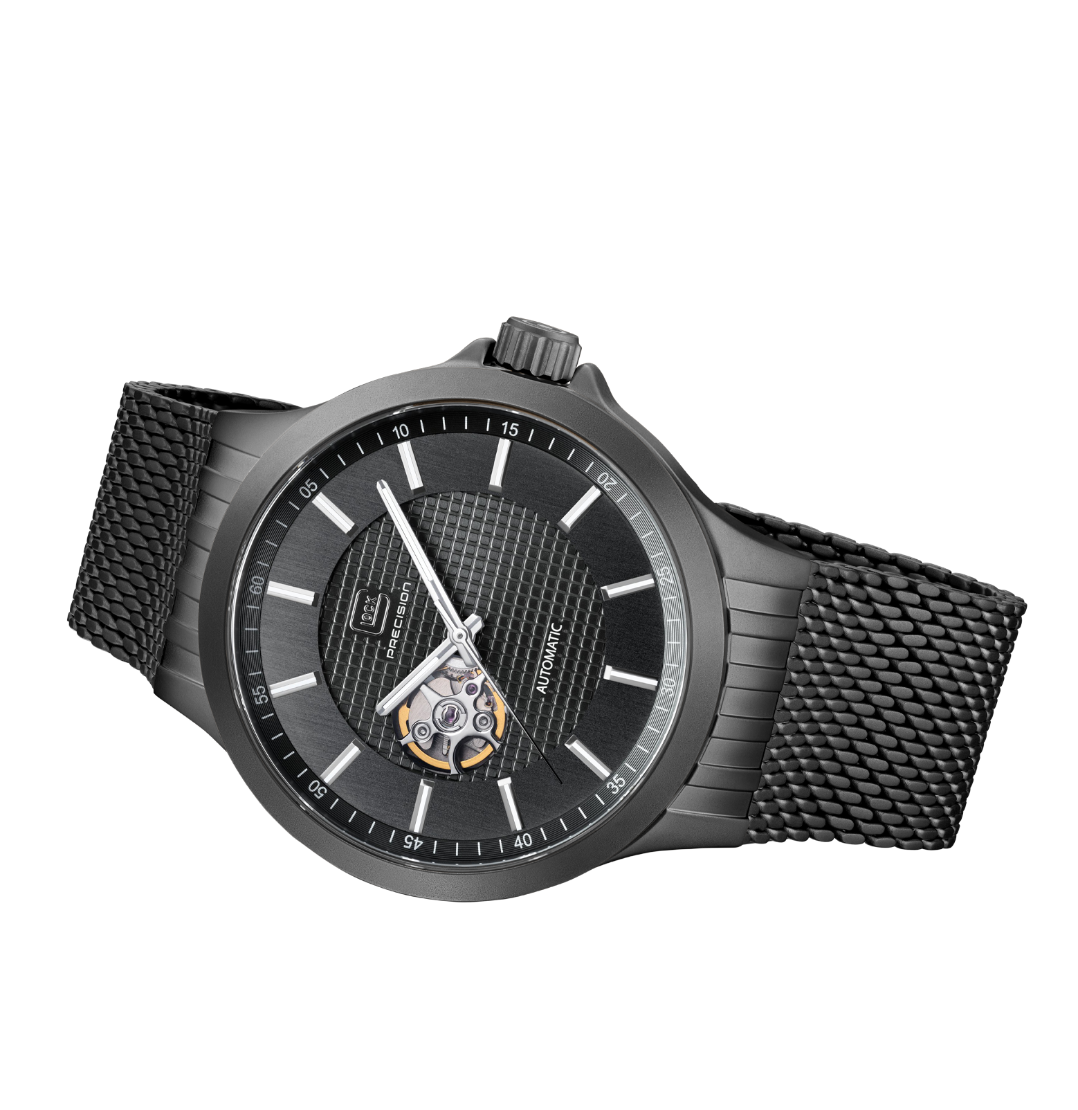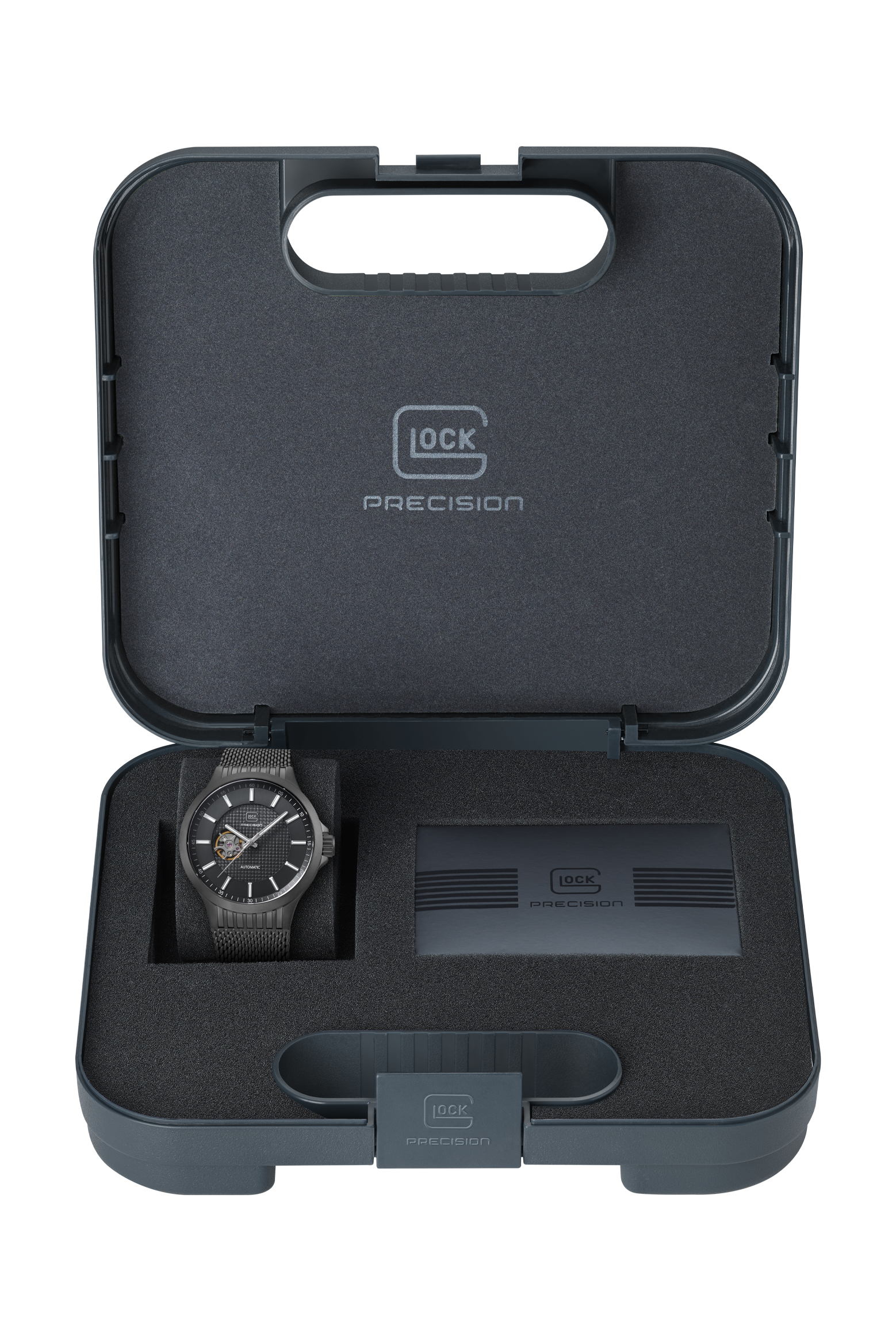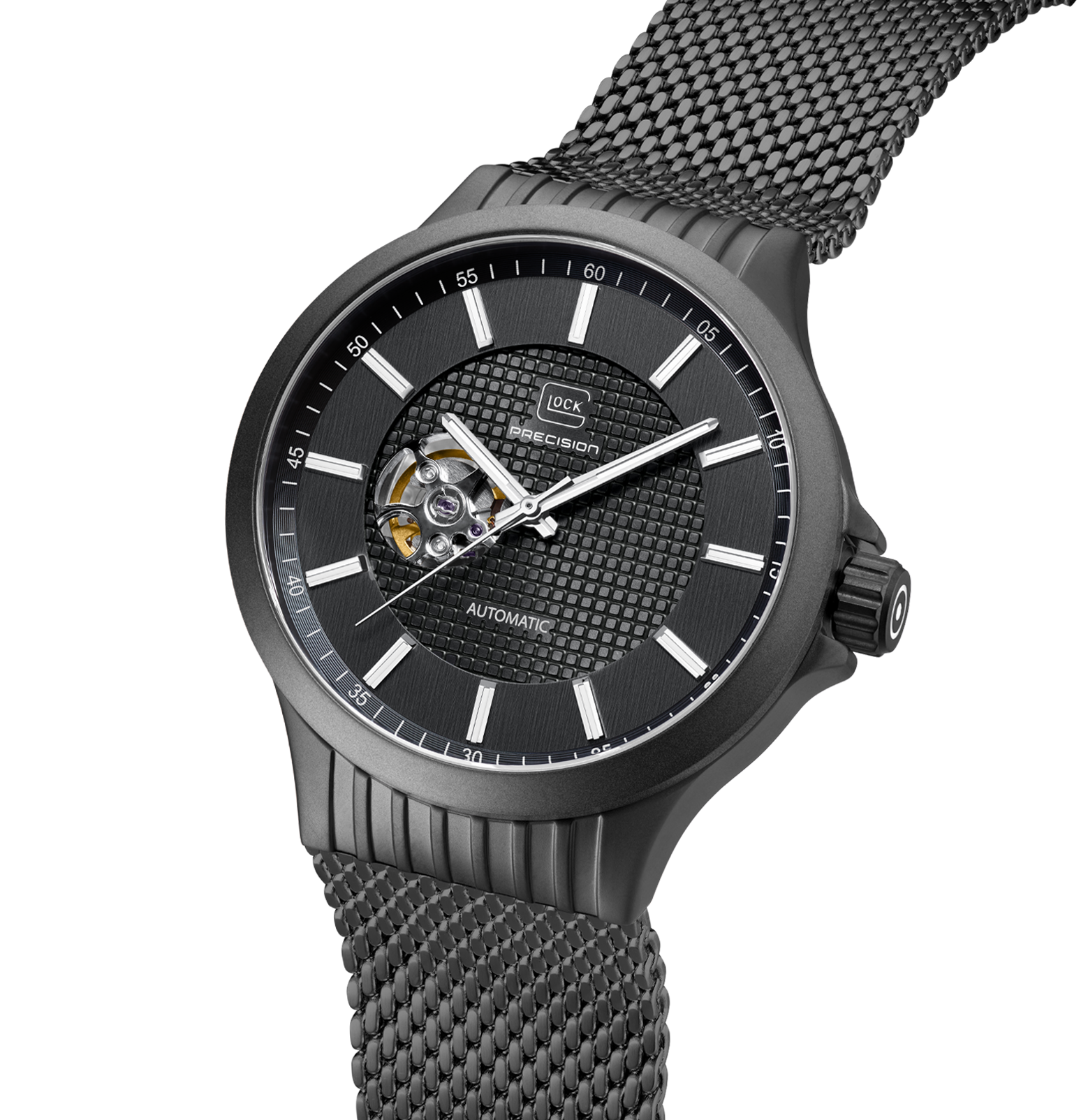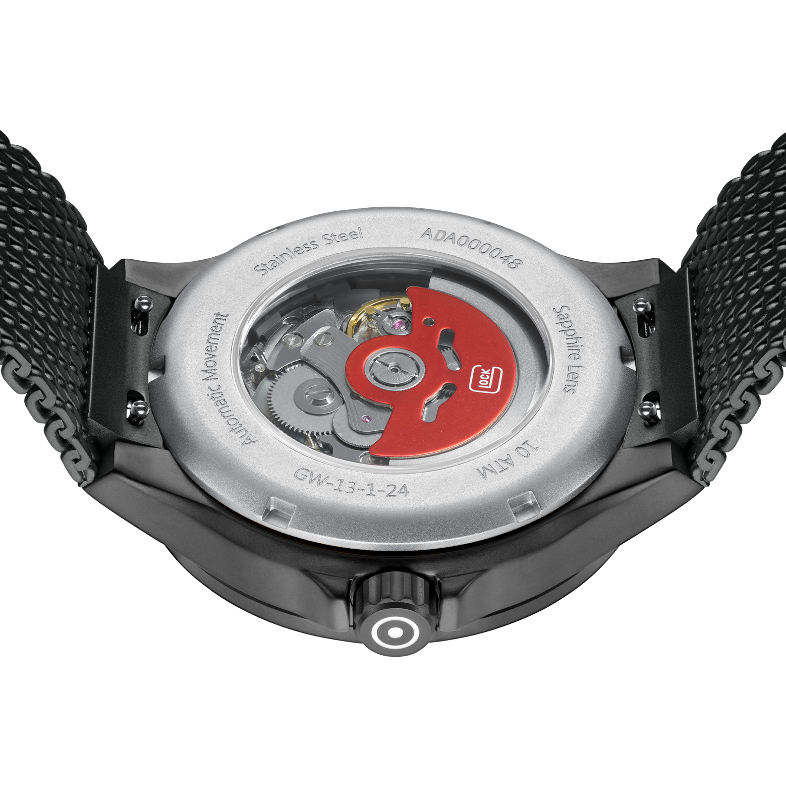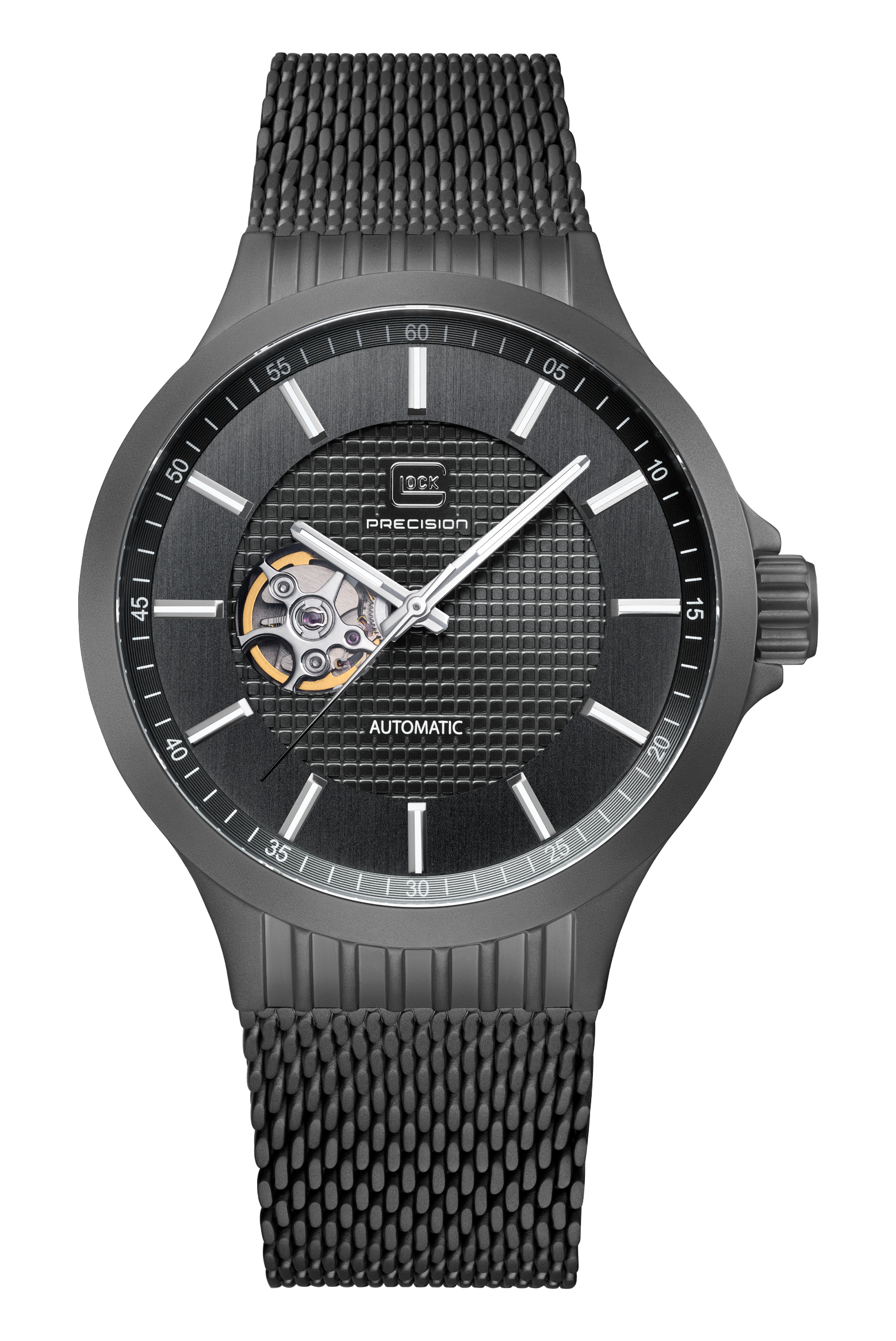 Glock Watches Gender: Men's Case Size (MM): 44 Strap: Mesh Feature(s): Super-LumiNova hands and indices Movement: Automatic Case Color: Black