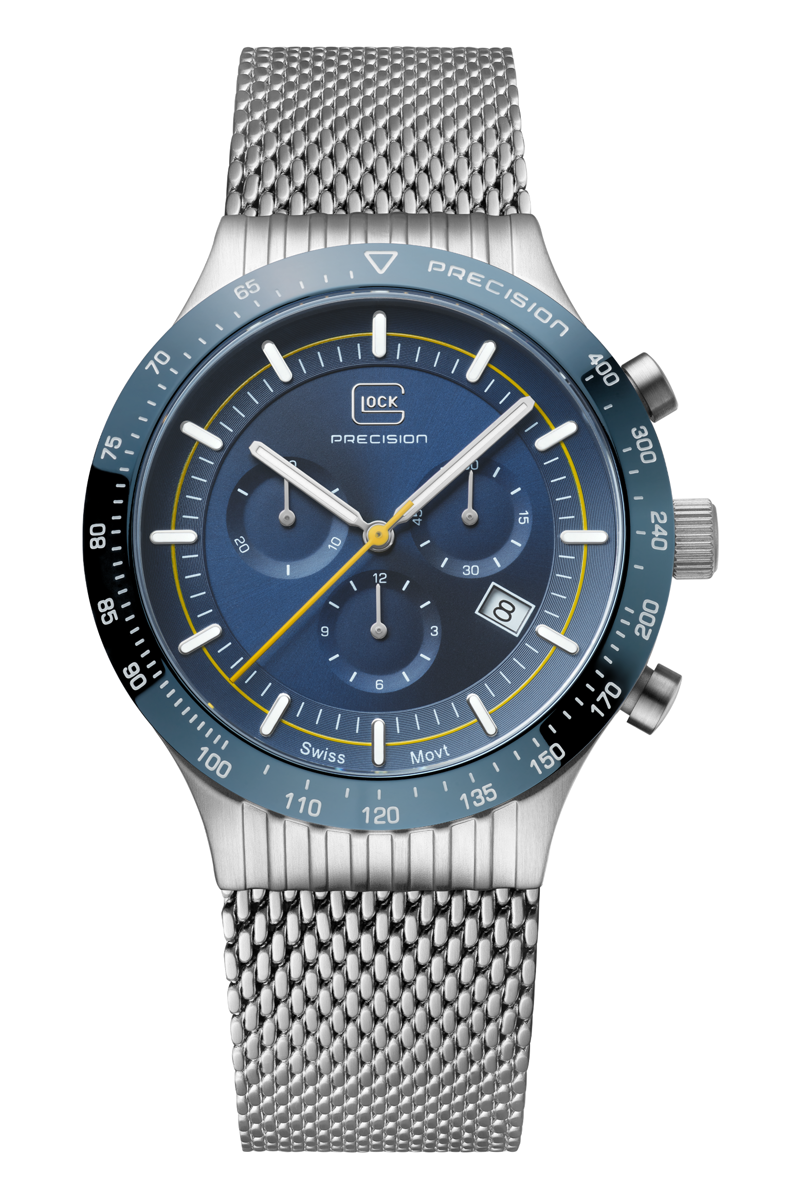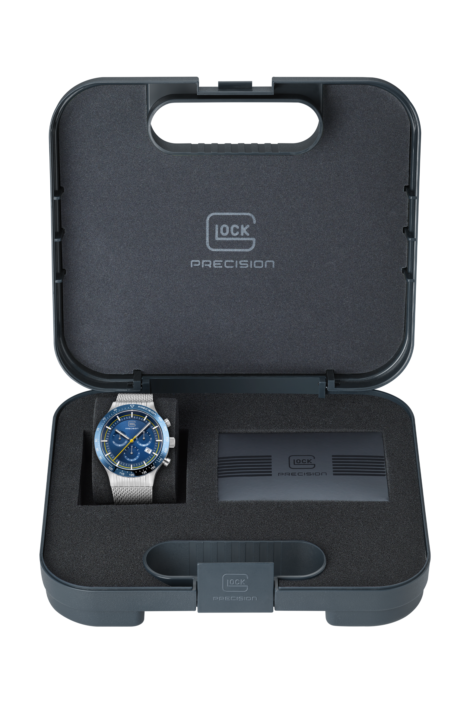 Glock Watches Gender: Men's Case Size (MM): 43 Strap: Mesh Feature(s): Super-LumiNova hands and indices Movement: Quartz Case Color: Stainless