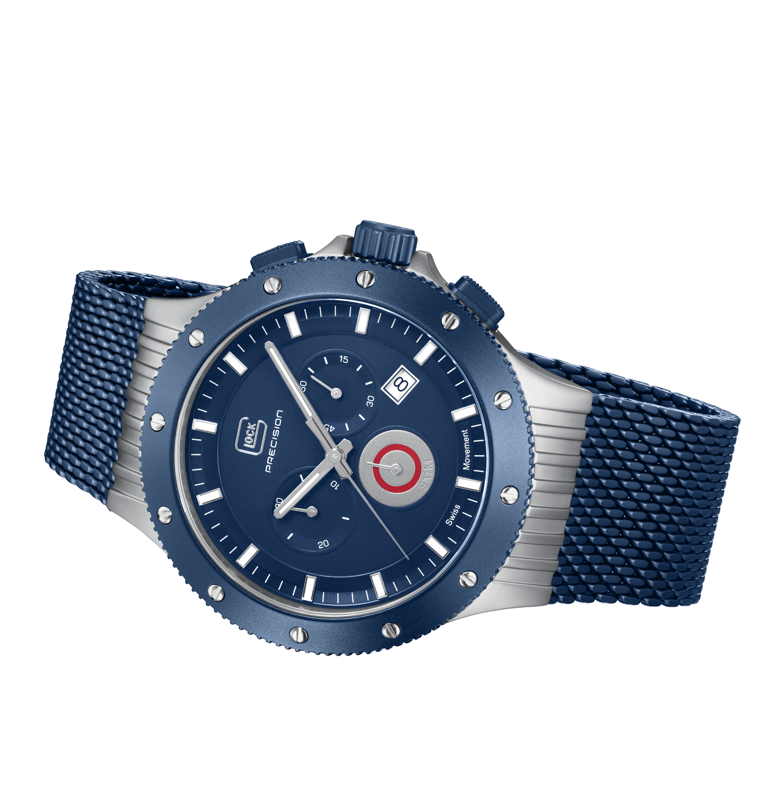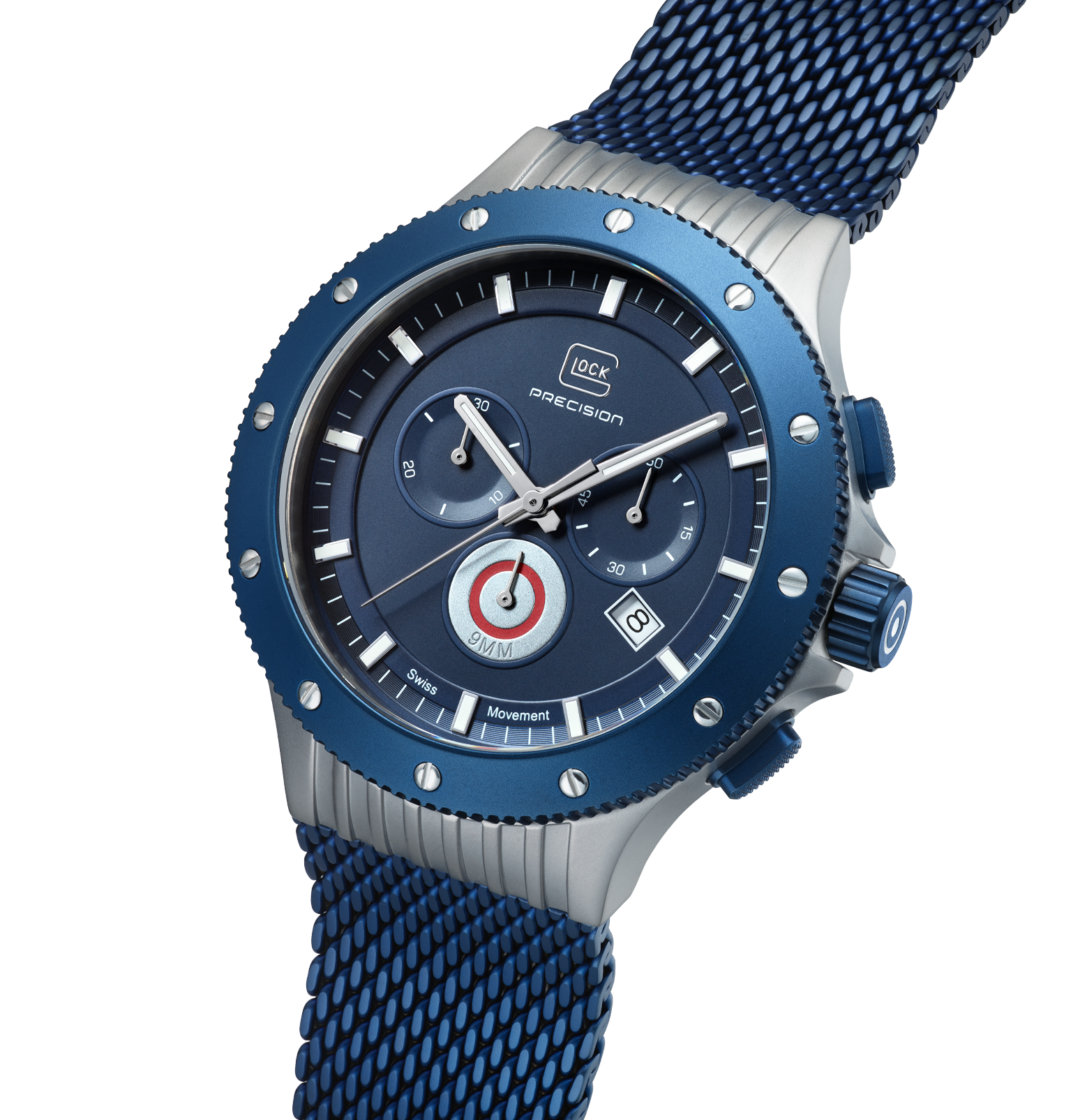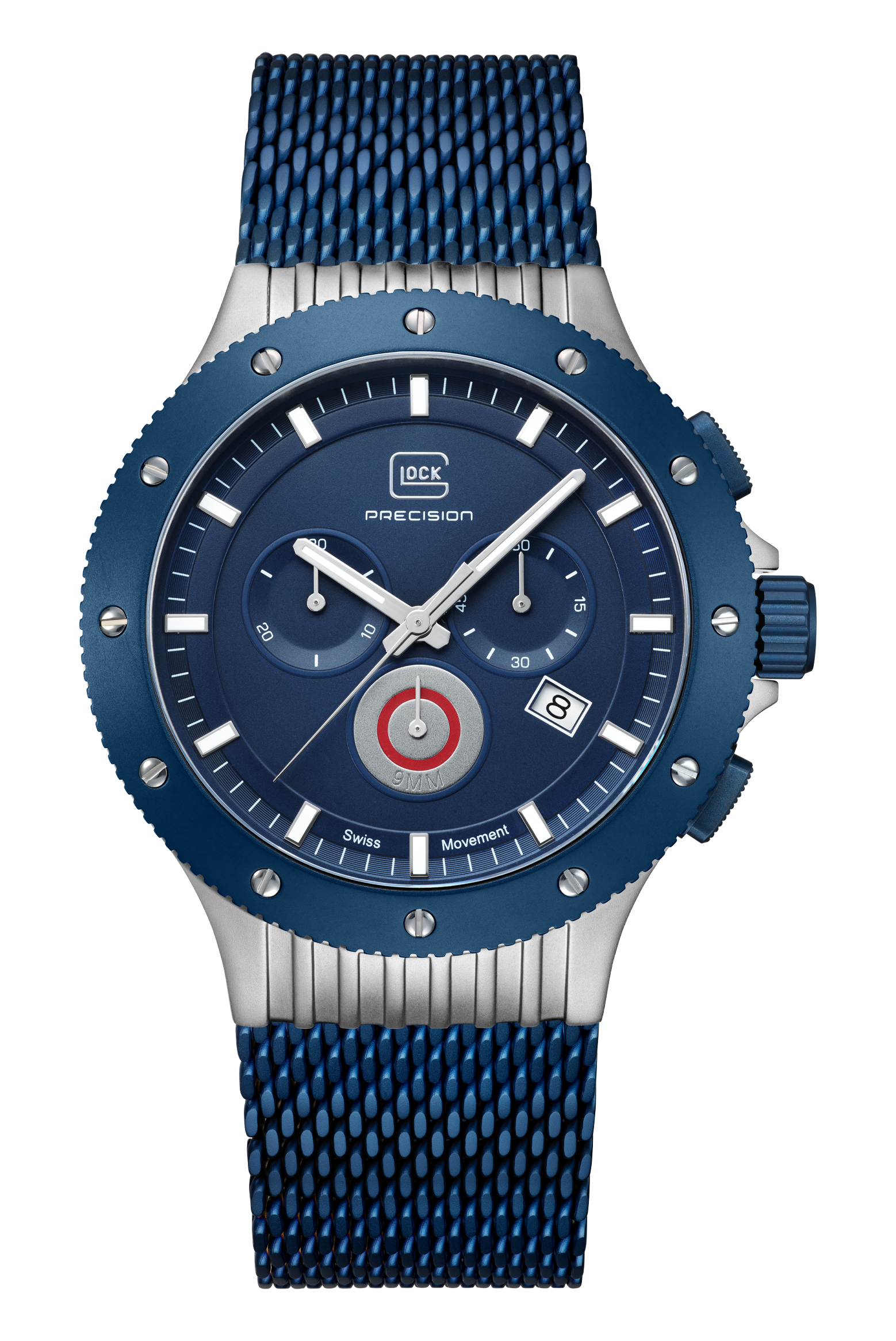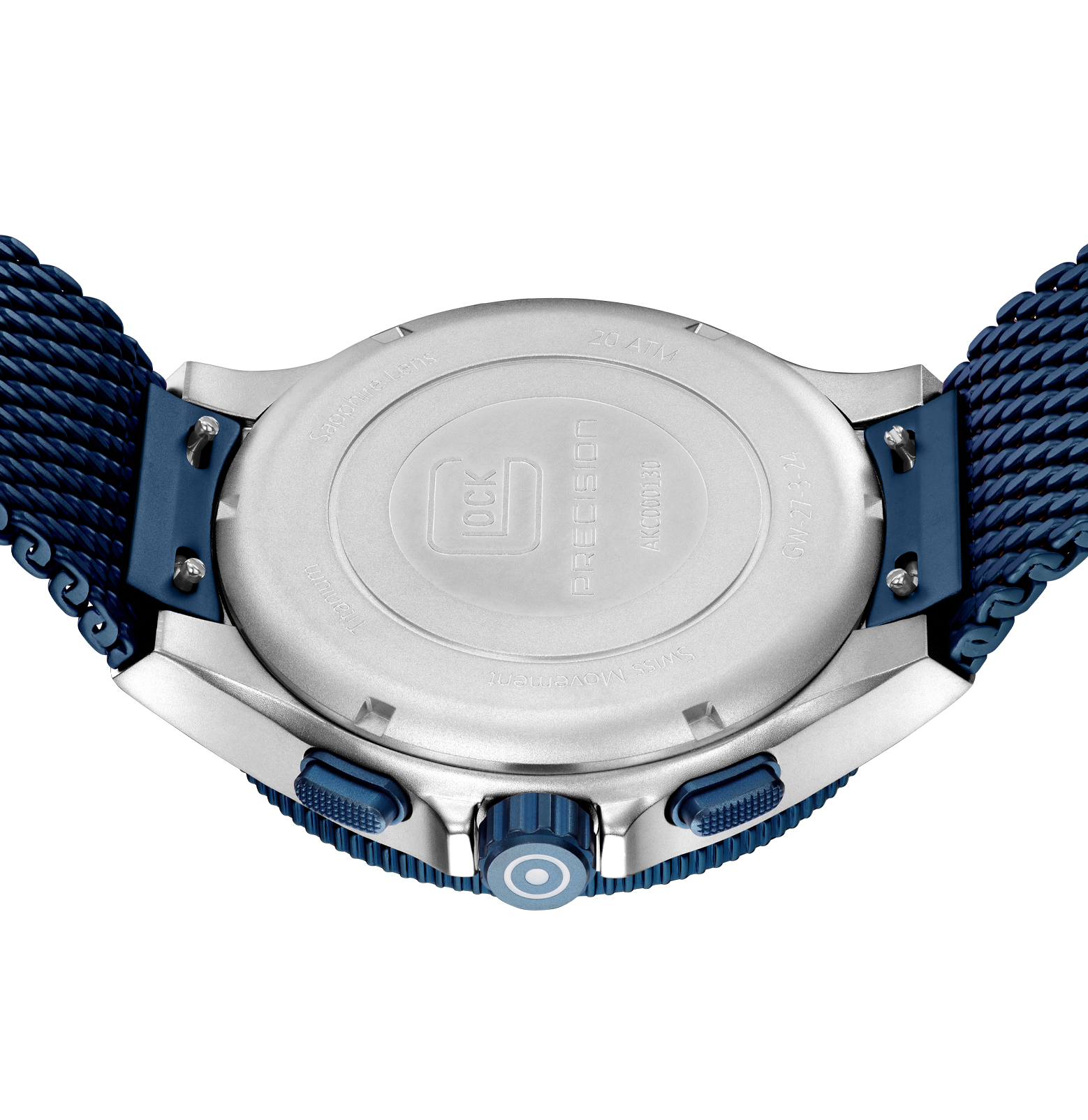 Glock Watches Gender: Men's Case Size (MM): 44 Strap: Mesh Feature(s): Super-LumiNova hands and indices Movement: Quartz Case Color: Stainless
