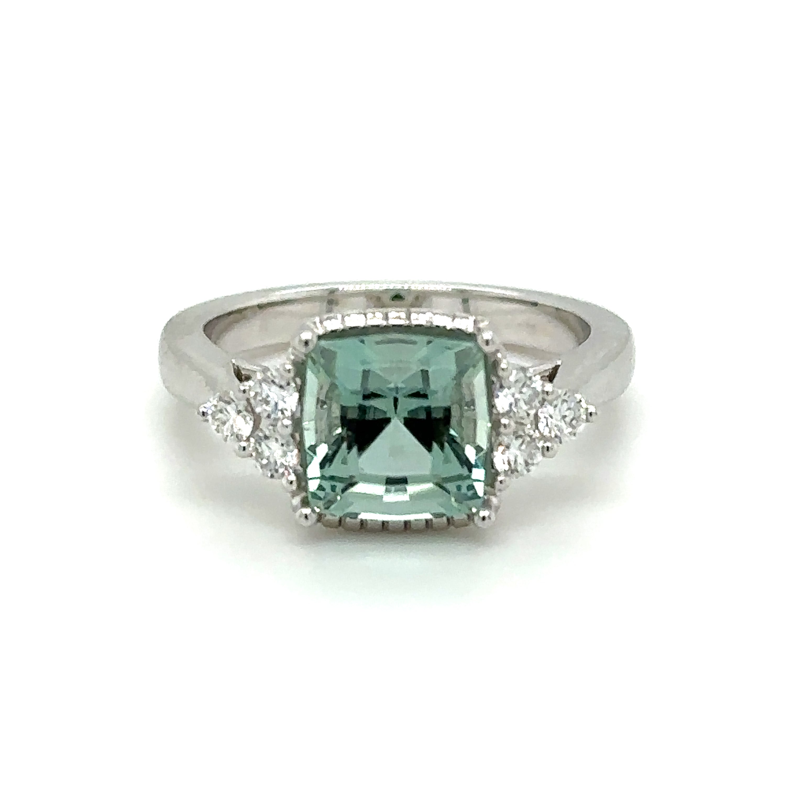 Lady's White 18 Karat Geometric Colored Ring Size 0.3 # of Melee: 6 Melee Quality: HSI Major Stone Carat Weight: 2.54 Major Stone Color: Green Major Stone Type: Beryl