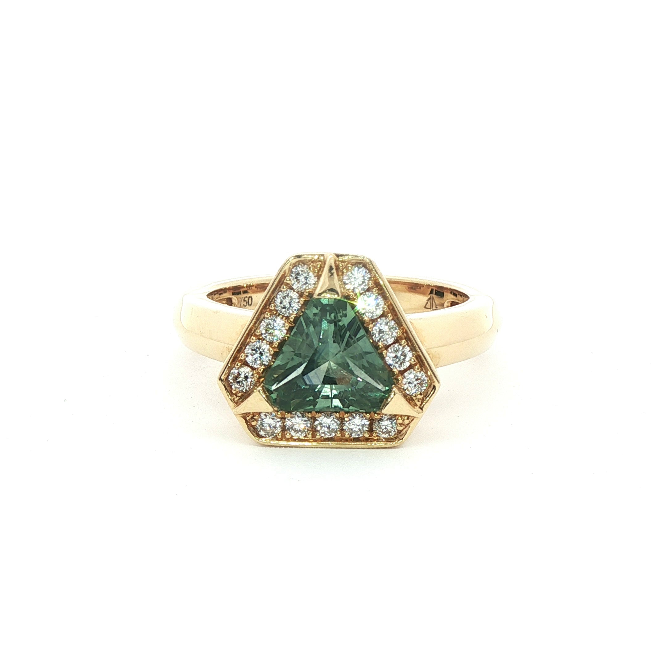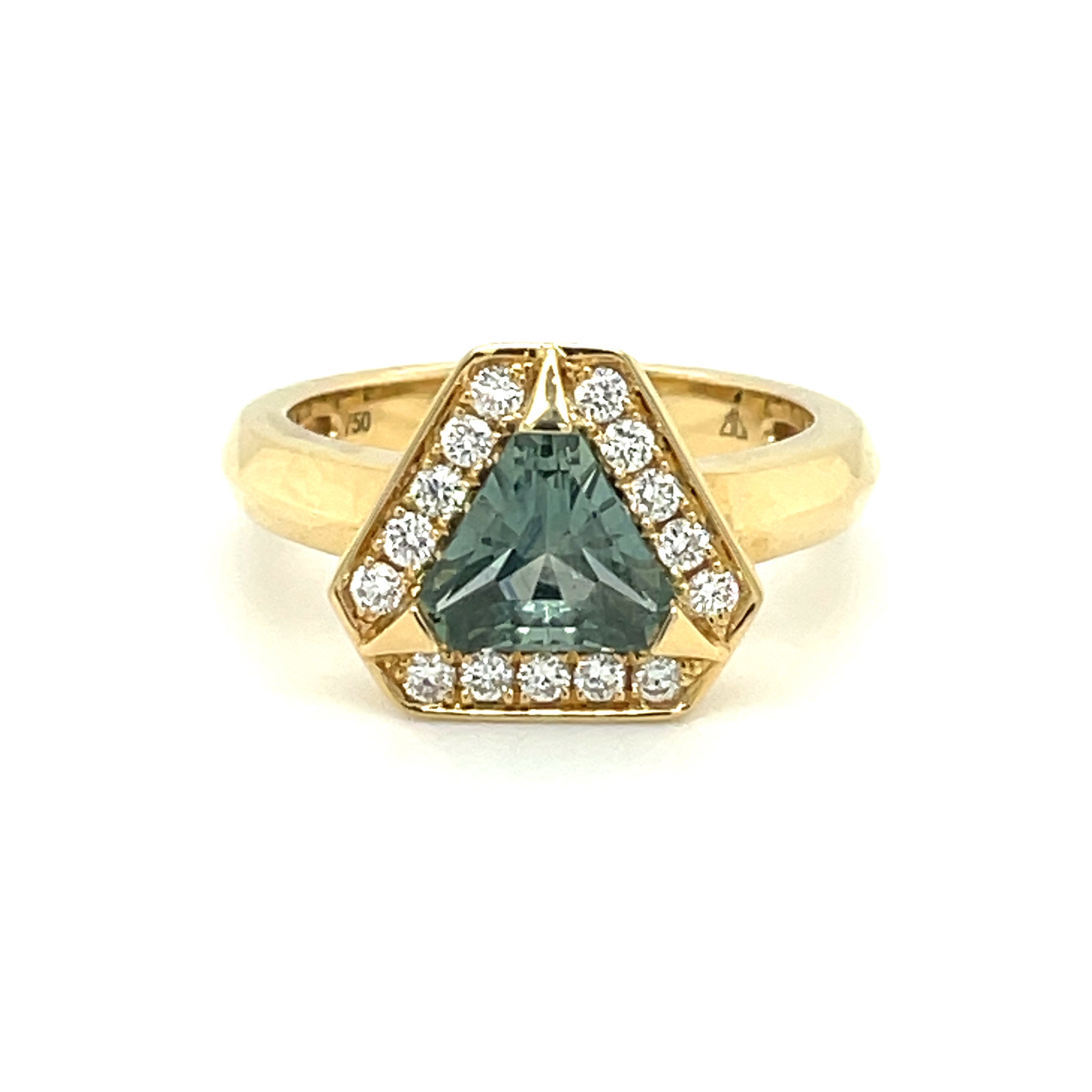 Lady's Yellow 18 Karat Geometric Colored Ring Size 0.26 Melee Quality: HSI Major Stone Carat Weight: 1.50 Major Stone Color: Montana Major Stone Type: Sapphire