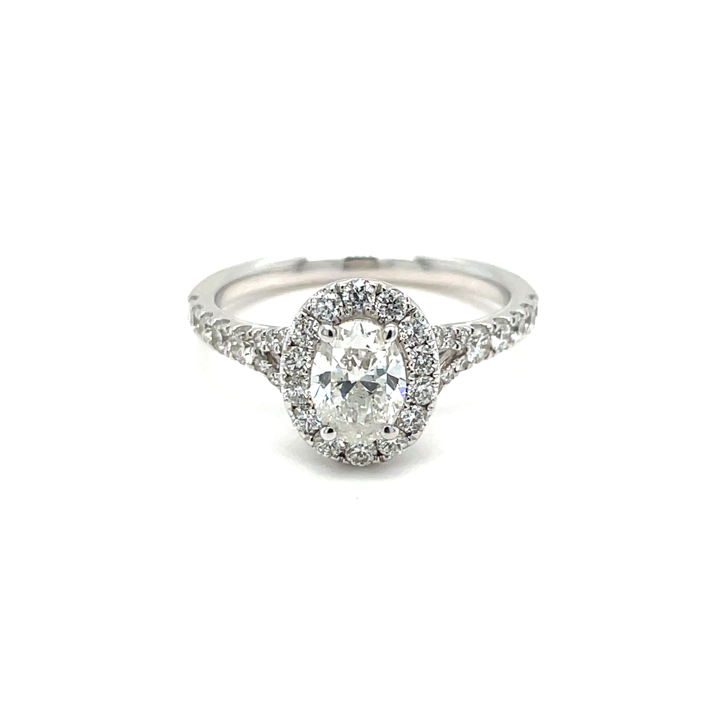 Lady's White 14 Karat Splitshank Oval Halo Engagement Ring Size 7 Melee Carat Weight: 0.60 Melee Quality: HSI Shape: Oval Brilliant Center Carat Weight: 0.75 Color: H Clarity: SI2