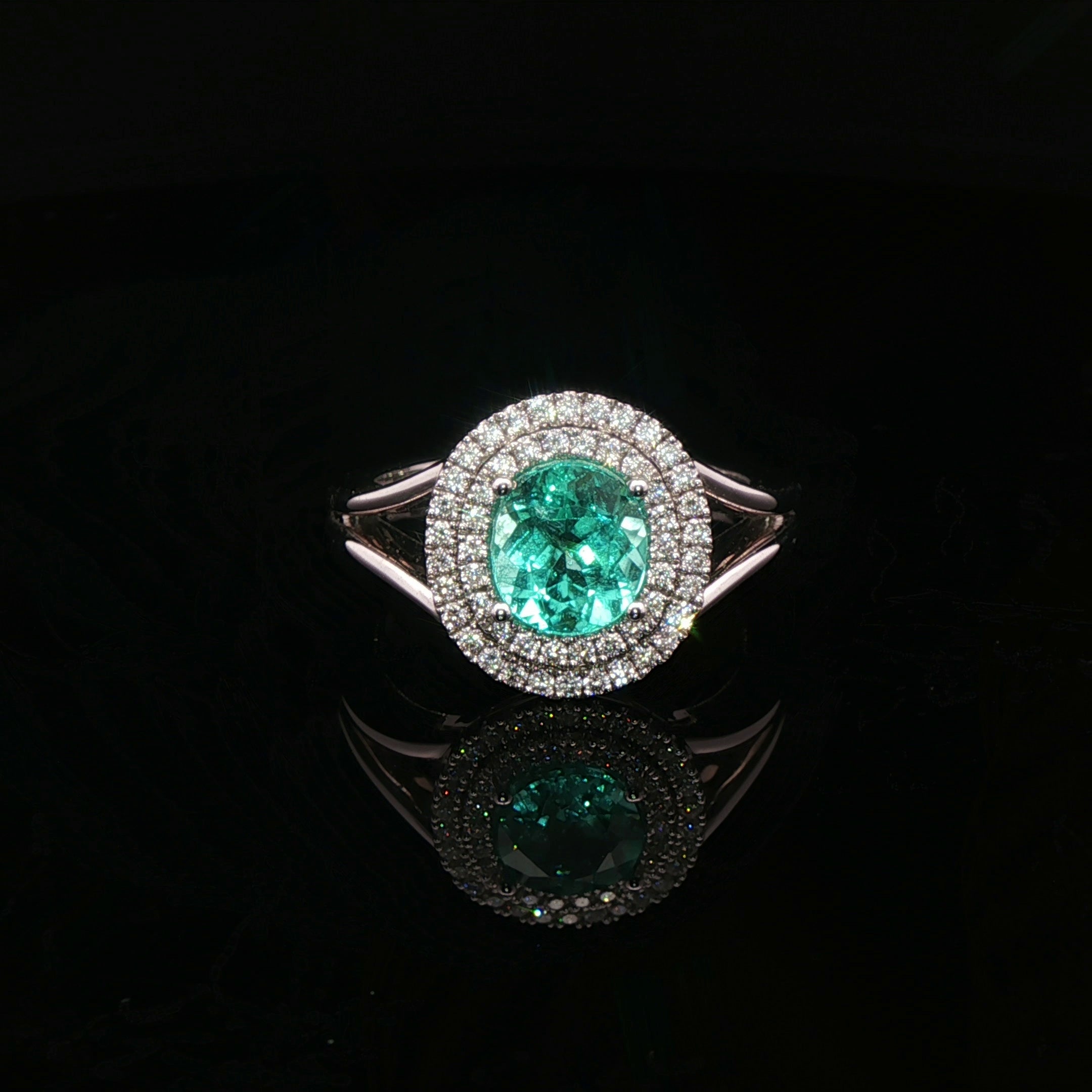 Lady's White 18 Karat Halo Colored Ring Size 0.29 Melee Quality: HSI Major Stone Carat Weight: 1.25 Major Stone Color: Paraiba Major Stone Type: Tourmaline