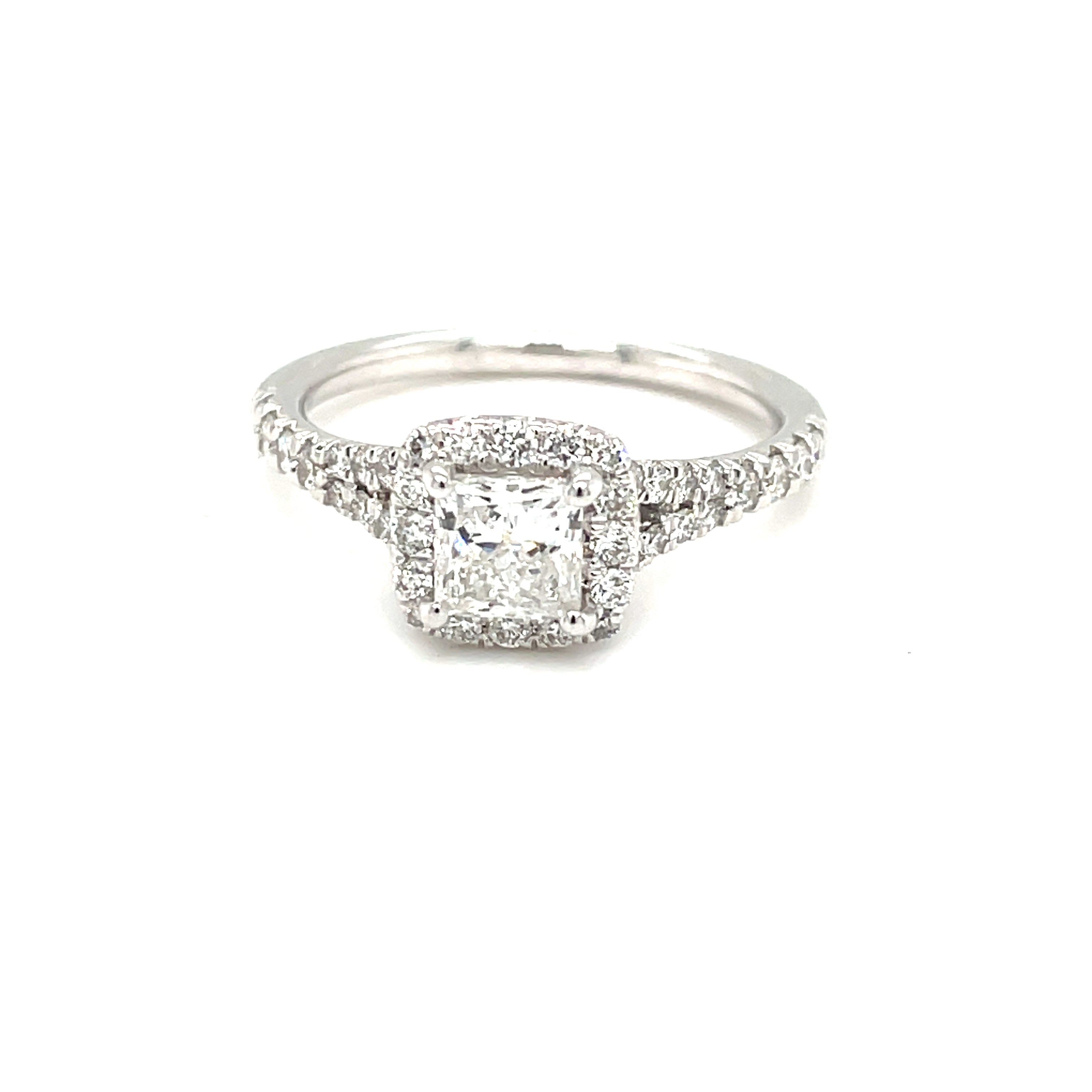 Lady's White 14 Karat Split Shank Halo Engagement Ring Melee Carat Weight: 0.48 Melee Quality: HSI Shape: Princess Carat Weight: 0.75 Color: HI Clarity: SI2
