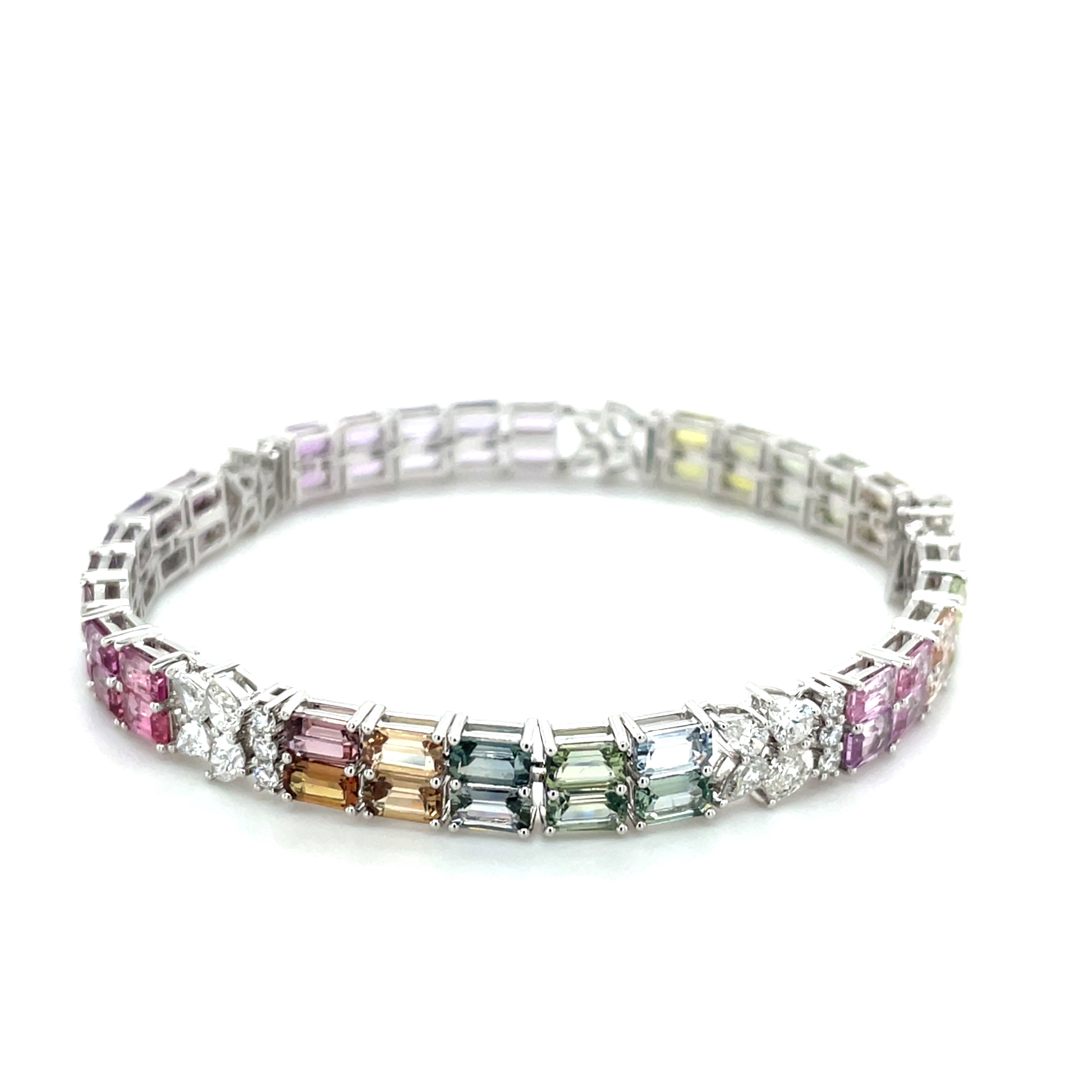 Lady's White 18 Karat Tennis/Line Bracelet Melee Carat Weight: 2.85 (35) Melee Quality: HVS Major Stone Carat Weight: 18.57 Type: Sapphire Color: Multi
